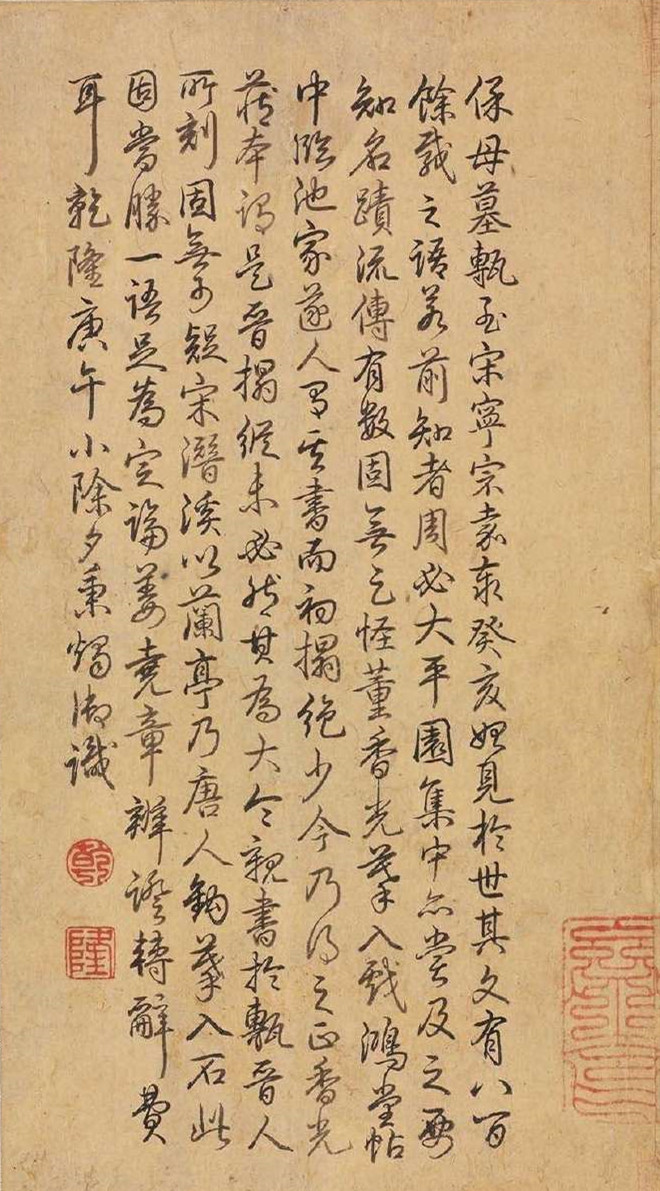 释文:保母墓砖至宋宁宗嘉泰癸亥始见于世,其文有八百余,载之语若前,知者周必大《平园集》中亦尝及之。要知名迹流传有数,固无足怪董香光摹入戏鸿堂帖中。临池家遂人有其书,而初搨绝少,今乃得之,正香光藏本,谓是晋搨,纵未必然,其为大令亲书于砖,晋人所刻固无可疑。宋潜溪以兰亭乃唐人钩摹入石,此固当胜一语足为定论,姜尧章辨证转辞费耳。
