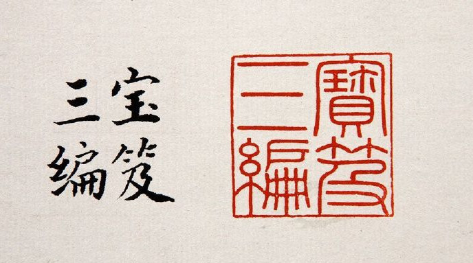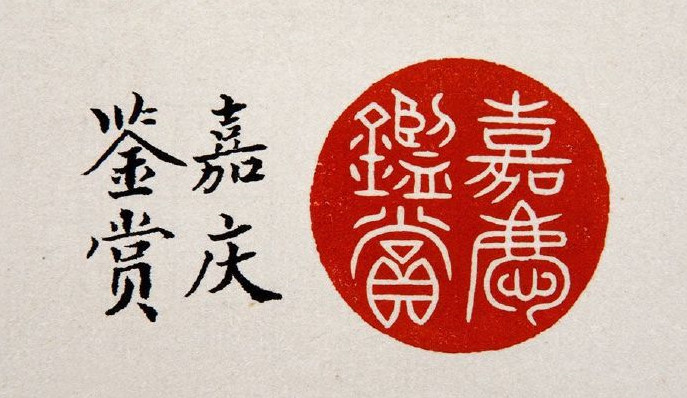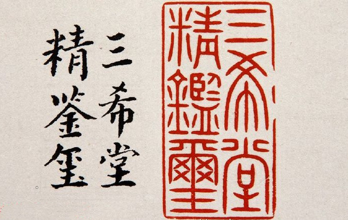此五玺为嘉庆帝著名的鉴藏类宝玺,相互配套使用,主要钤盖于《石渠宝笈》《秘殿珠林》三编著录过的书画作品之上,具体使用情况在《石渠宝笈》《秘殿珠林》三编的“凡例”中有明确说明。三编“凡例”载:“初编、续编各件书画后皆列鉴藏宝玺一条,兹一遵其例……古今臣工书画则用嘉庆御览之宝、嘉庆鉴赏、三希堂精鉴玺、宜子孙,或曰秘殿珠林,或曰石渠宝笈,凡五玺。又加珠林三编或宝笈三编一玺,以示别于续编。”可知被《石渠宝笈》《秘殿珠林》三编著录过的古今臣工的书画作品上都钤有嘉庆的这套“嘉庆鉴赏”“三希堂精鉴玺”和“宜子孙”玺。很显然,嘉庆皇帝的这套宝玺完全仿自乾隆帝的“三希堂精鉴玺”组玺,但二者细微之处仍有所差别,这是鉴别清宫书画收藏著录情况最明显的标志之一。