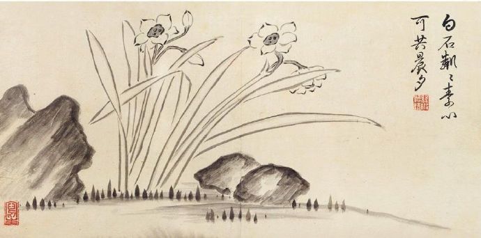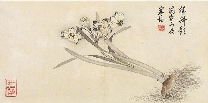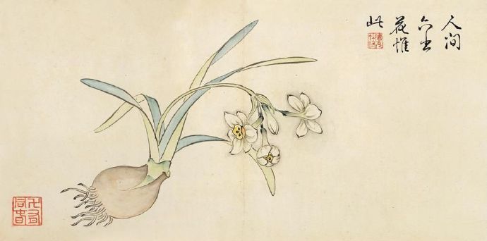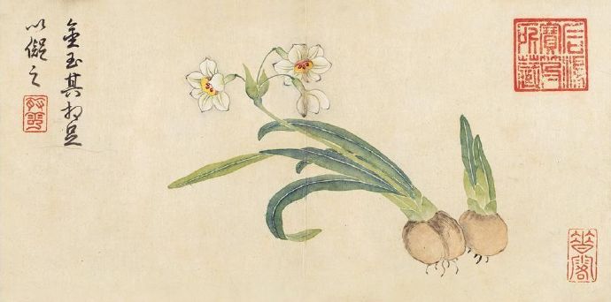 《石渠宝笈》著录此作品原为八开册页,今仅见四开。其余四开未知去向。乾隆政务之暇,极好翰墨,据其自云,书法几乎每日必作。偶涉绘事,或山水,或松竹花卉,虽非专门家,但出笔不俗,殊不易。此水仙四帧,以极佳纸作,或水墨,或双钩,或设以淡色,或竟以没骨,估计是目之所见,心有所感,兴之所至,泚毫所作的。构图虽简,但造型甚准,最不易者能神闲意定,故有安祥平和之趣,堂皇富贵之态。自题“金玉其相,足以儗之”,帝王出口,位置自高。