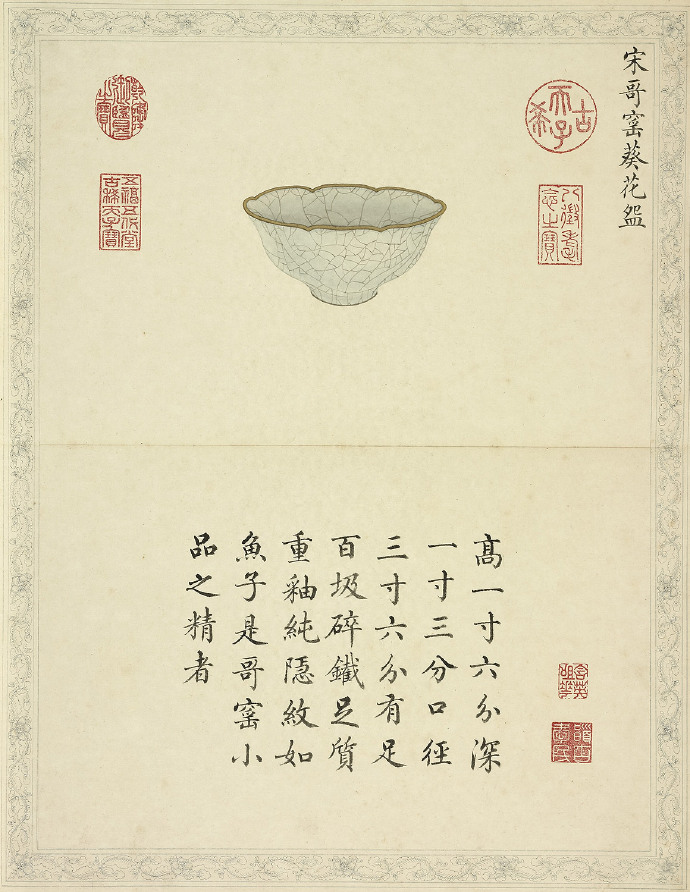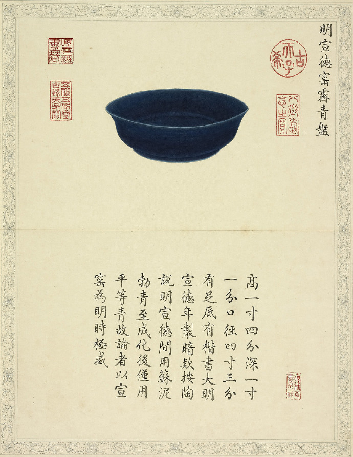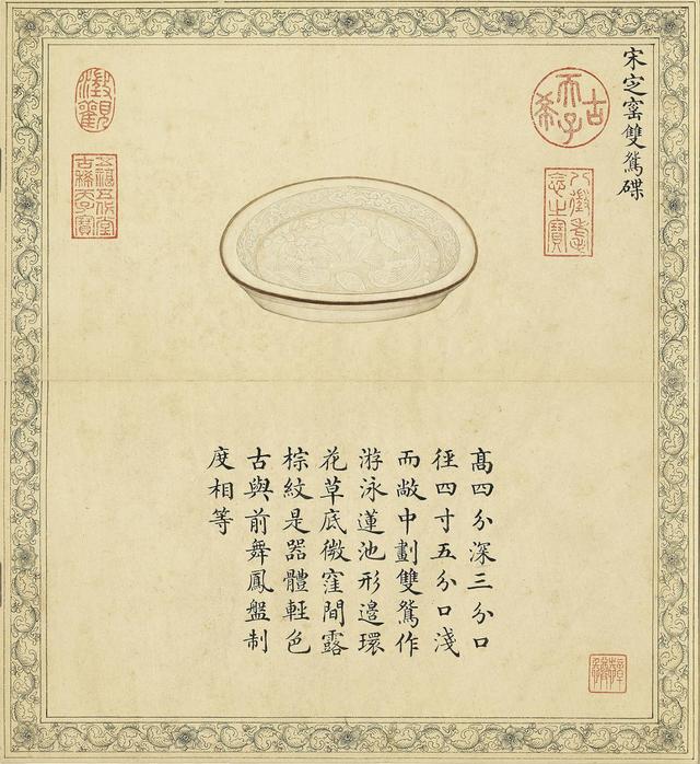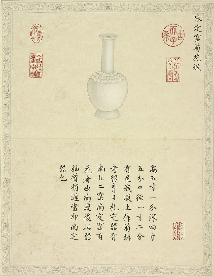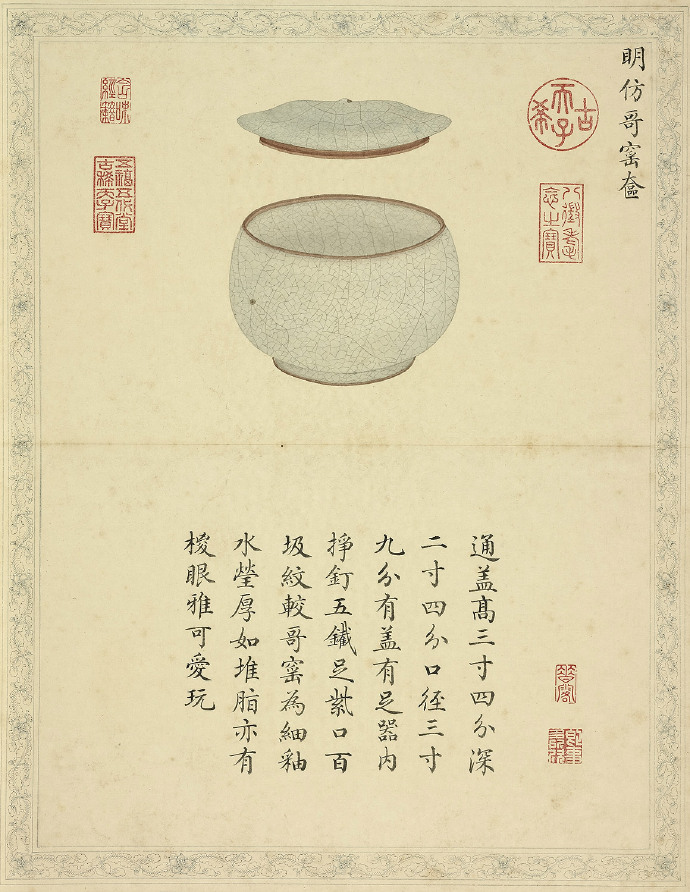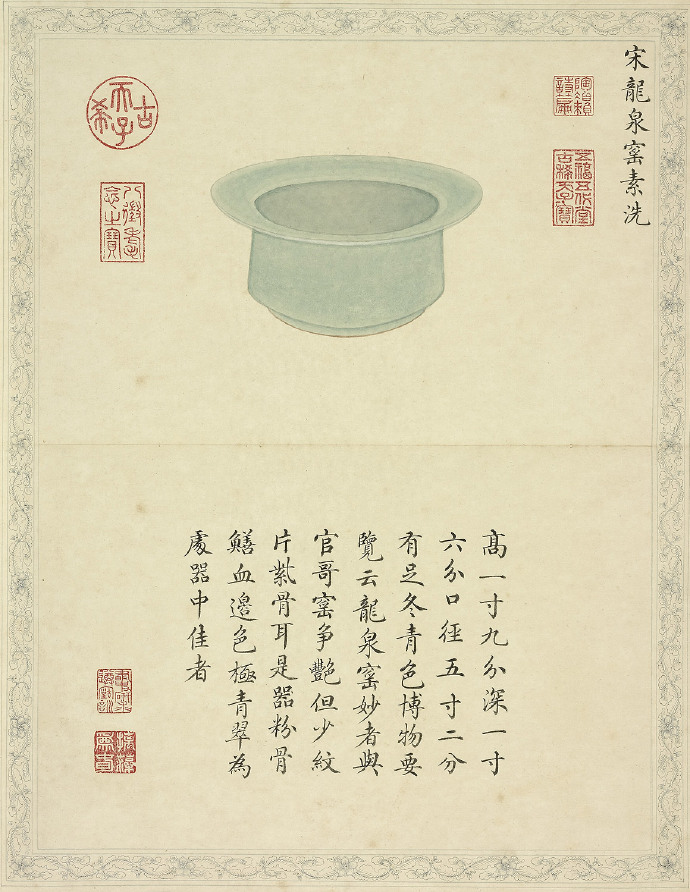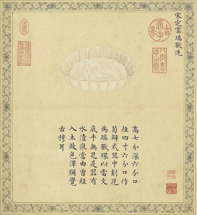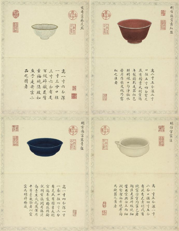 《精陶韫古》图册,册页,纸本,台北故宫博物院藏。此本图册同《珍陶萃美》一样,共画有10件瓷器,也绘制于乾隆五十年(1785)。两本图册收录的作品,透过原载品名,得知为定、官、哥、钧、龙泉窑,以及明朝宣德、万历官窑制品。既是一本可以赏玩的古玩册,也可以说是一份内府藏瓷的档案资料。每页作对开装裱,上页为品名与图画,下页纪录尺寸、釉色、形制、款识和前人的品评。画中收录的作品,透过原载品名,得知为定、哥、龙泉窑,以及明朝宣德、万历官窑制品,其实与乾隆皇帝降旨镌刻御制诗对瓷器的选择一样,透过图册与画中瓷器的对照,具体地传达出乾隆皇帝的鉴赏品味。