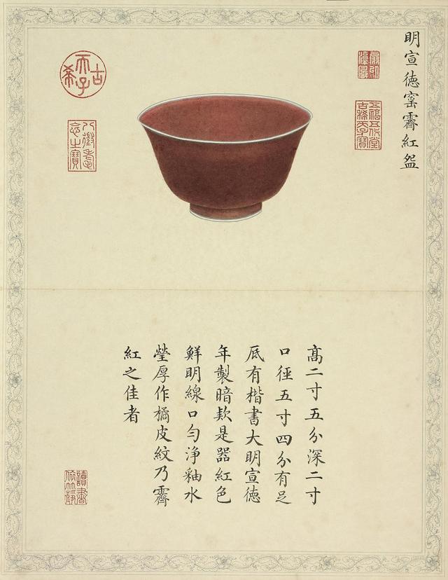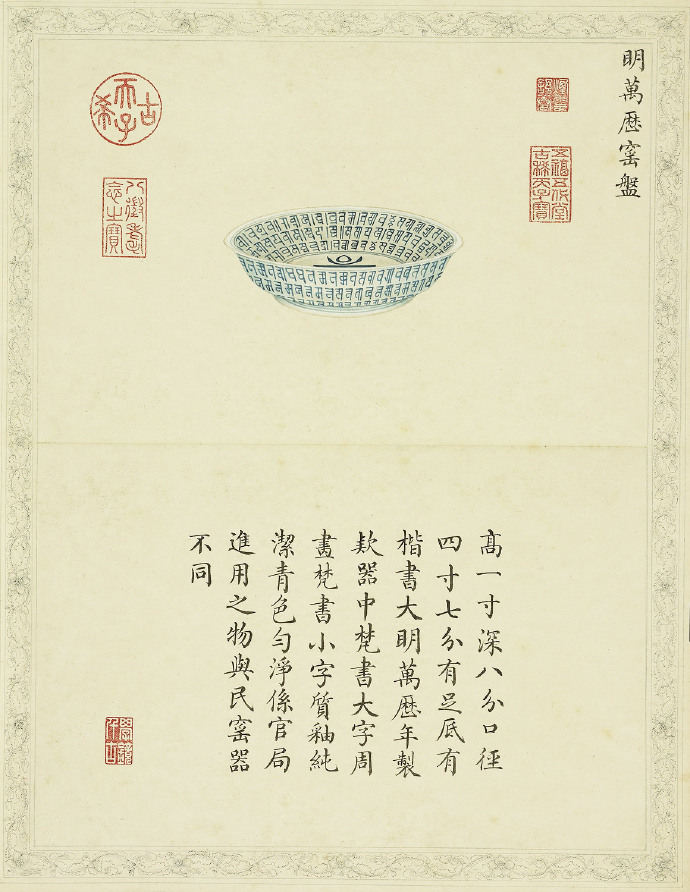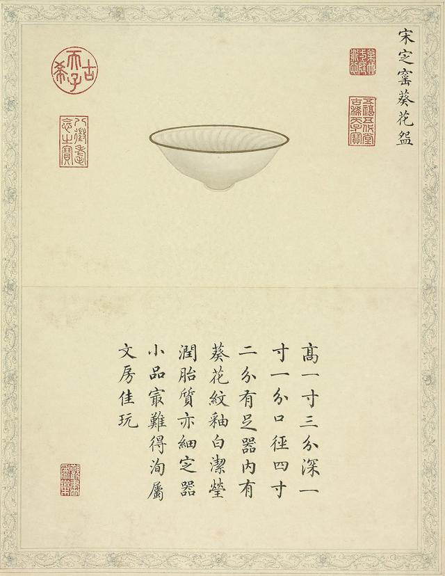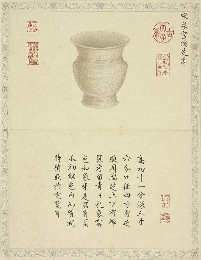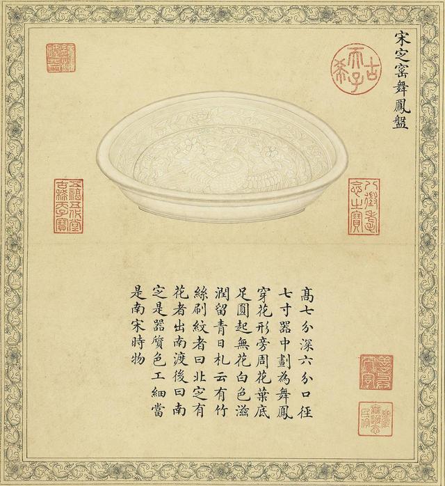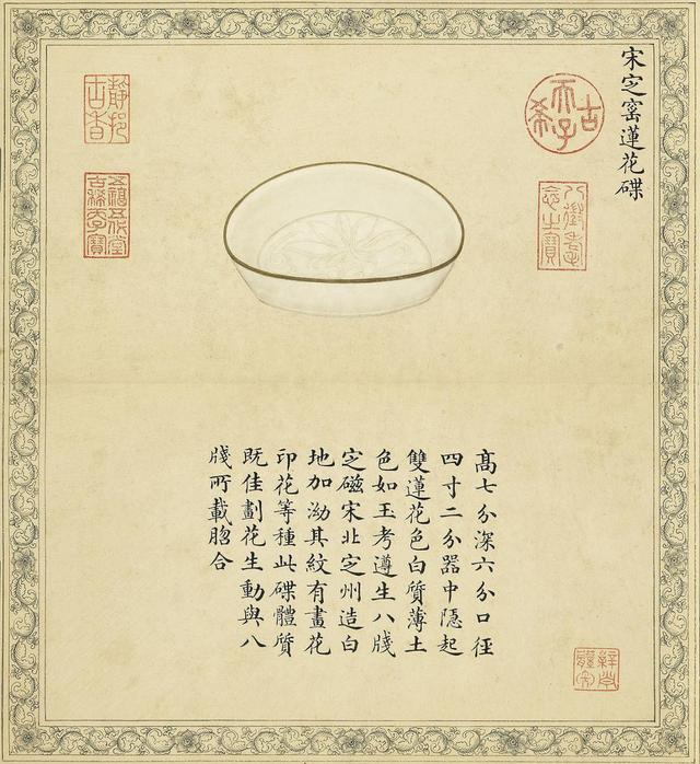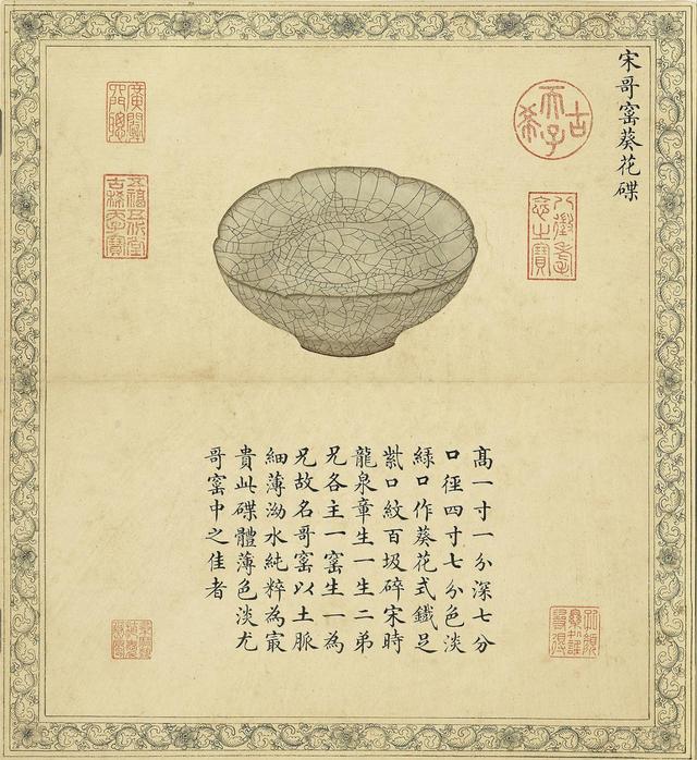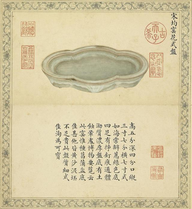 《精陶韫古》图册,册页,纸本,台北故宫博物院藏。此本图册同《珍陶萃美》一样,共画有10件瓷器,也绘制于乾隆五十年(1785)。两本图册收录的作品,透过原载品名,得知为定、官、哥、钧、龙泉窑,以及明朝宣德、万历官窑制品。既是一本可以赏玩的古玩册,也可以说是一份内府藏瓷的档案资料。每页作对开装裱,上页为品名与图画,下页纪录尺寸、釉色、形制、款识和前人的品评。画中收录的作品,透过原载品名,得知为定、哥、龙泉窑,以及明朝宣德、万历官窑制品,其实与乾隆皇帝降旨镌刻御制诗对瓷器的选择一样,透过图册与画中瓷器的对照,具体地传达出乾隆皇帝的鉴赏品味。