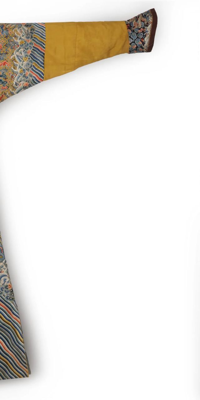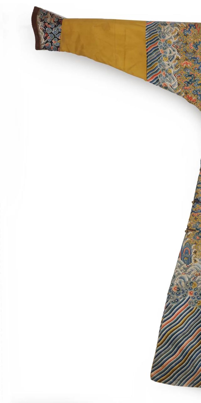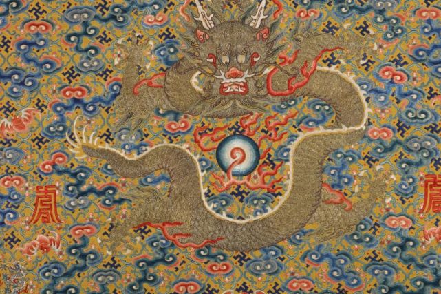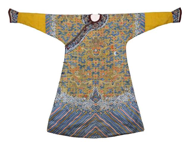 这件龙袍通身绣九条金龙,领前后正龙正襟危坐,一团威严;四条正龙绣于前胸、后背和两肩,前后衣襟下摆部位绣四条行龙,因此前后望去都是五条龙,寓“九五-尊”之意。龙纹之间绣以五彩云纹、蝙蝠纹,寓意“洪福齐天”,。袍身绣十二章纹,包括日、月、星辰、山、龙、火等,为最高统治者专有纹饰,象征着帝王皇恩浩荡,普照四方。据介绍,龙袍分很多种,这种吉服龙袍是皇帝在庆贺岁时节令、婚嫁礼仪、生辰庆典等公务场合时常穿用服装,是众多种类龙袍中,级别较高一种。
