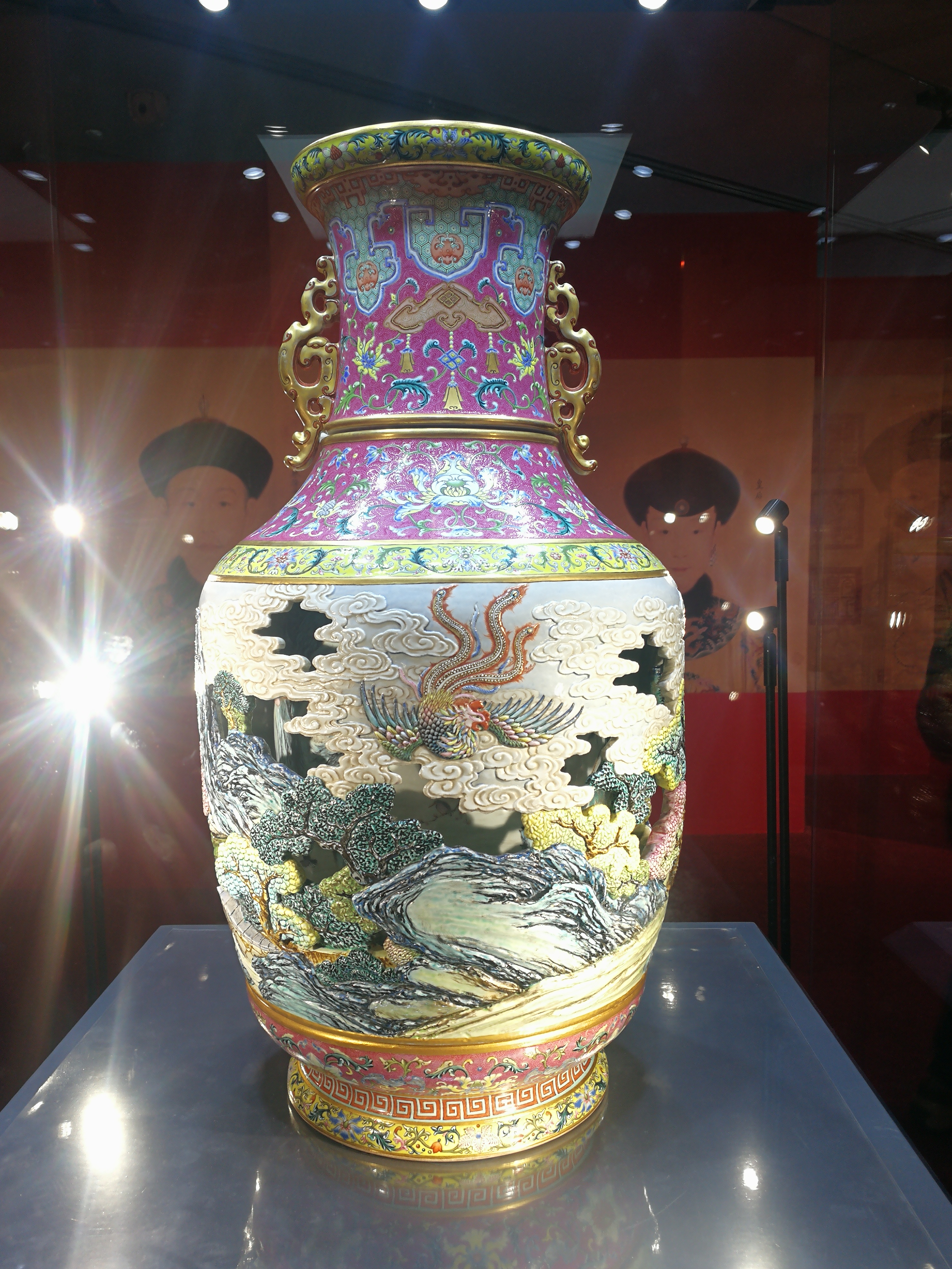 本器之体量颇大,高至63cm,为可流通于市场中最大者,亦为已知存世同类器中第二大者,仅次于故宫博物院藏天蓝釉开光大套瓶(高 73cm)。南京博物院藏霁蓝釉描金乾隆行围图旋转瓶,为该馆镇馆之宝,其高60.5cm,略小于本器。洋彩装饰与转心之效,颇见欧洲巴洛克风格,凤鸟山水则是传统中国题材,两相结合见大国盛世海纳百川之胸襟,堪为稀世之珍,冠绝于时。