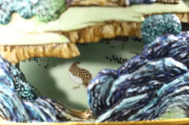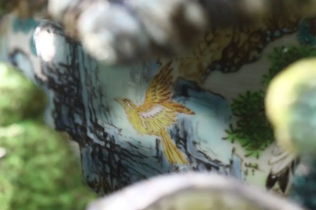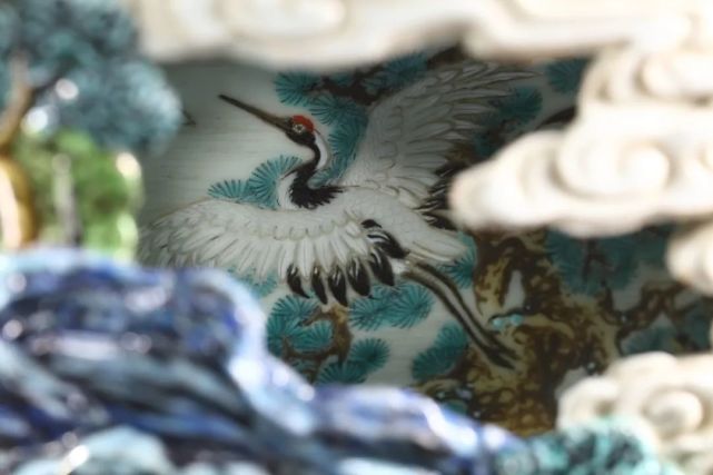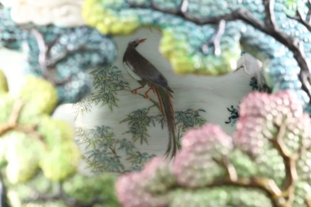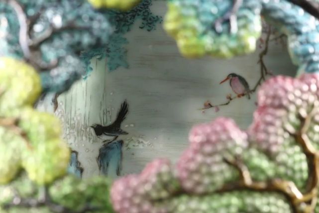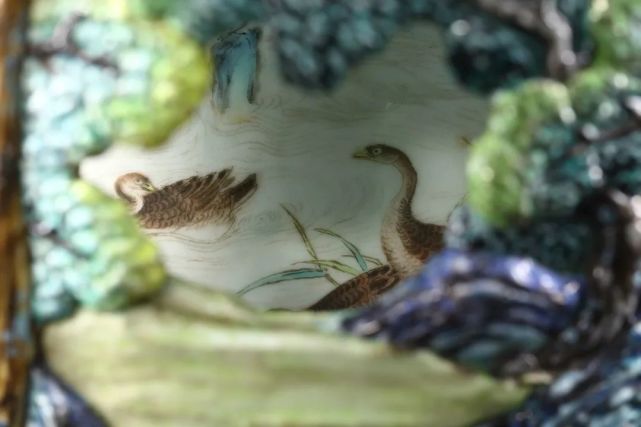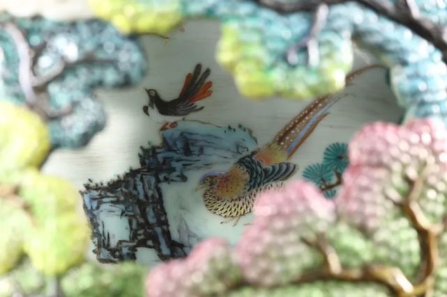 此瓶绘画笔意亦得清宫画家之妙,同主题之杰作如意大利传教士,后尊为御用宫廷画师之郎世宁绘《白鹰》、《锦春图》等,皆可于瓶身观得相似之神韵。颈、肩及近足处皆饰胭脂红地或黄地勾莲纹,轧道为地,花卉枝叶深得西洋巴洛克之风,是为乾隆时期御制洋彩佳作。在平面艺术之外,建筑与陶瓷艺术则最集中地体现这种乾隆“巴洛克”风格。此瓶内外两层,犹如布景之前景与背景。前景中的每一处镂空,都好似侧景与檐片景造就的舞台效果。观者绕转心瓶而行,自山峦之不同角度向内窥望,好似舞台切换侧景。轻轻转动瓶颈,内瓶所绘群鸟穿行于外瓶之山峦云端间,似舞台之背景亦在不断切换。随观者步移、随内瓶转旋,前后景致交叠错落,似有万千组合、万千画面。景深与空间感,不断切换变动的视野与背景,皆深得巴洛克风格之精髓。