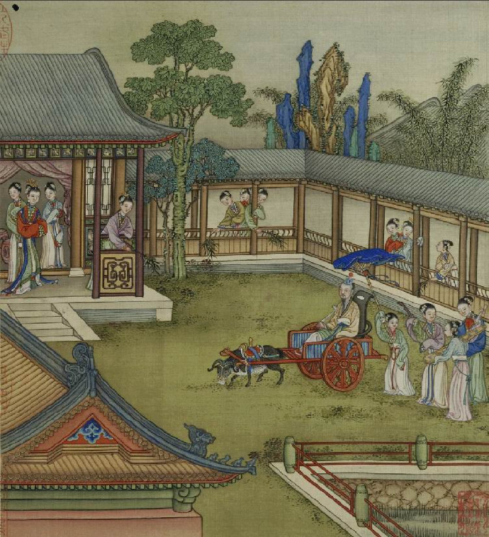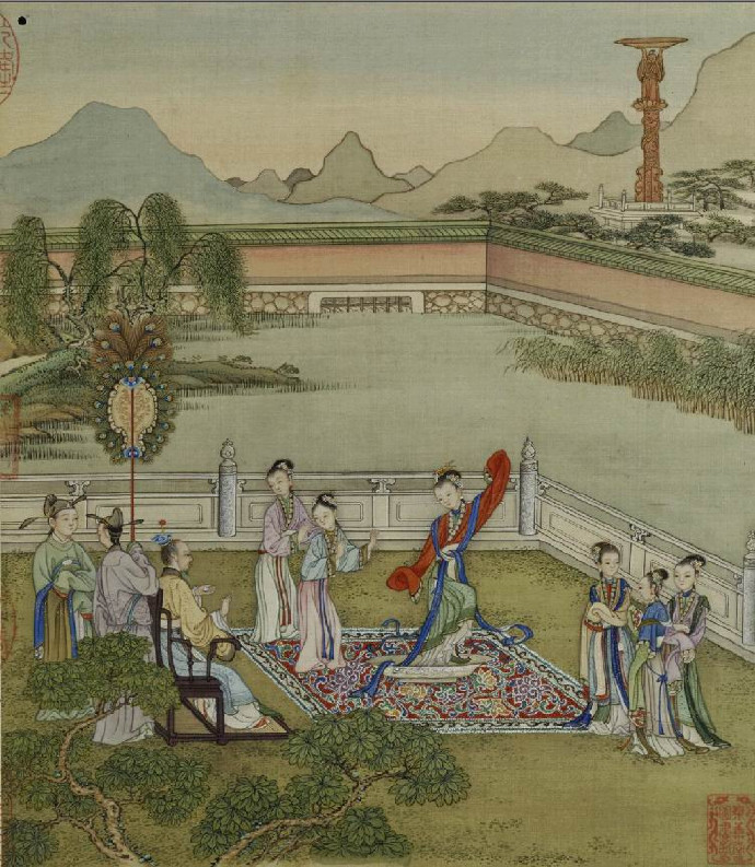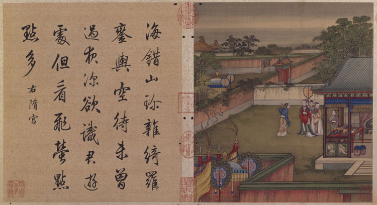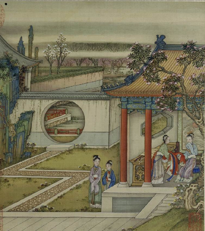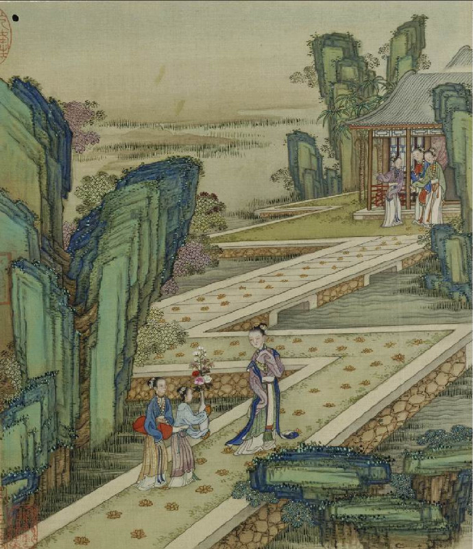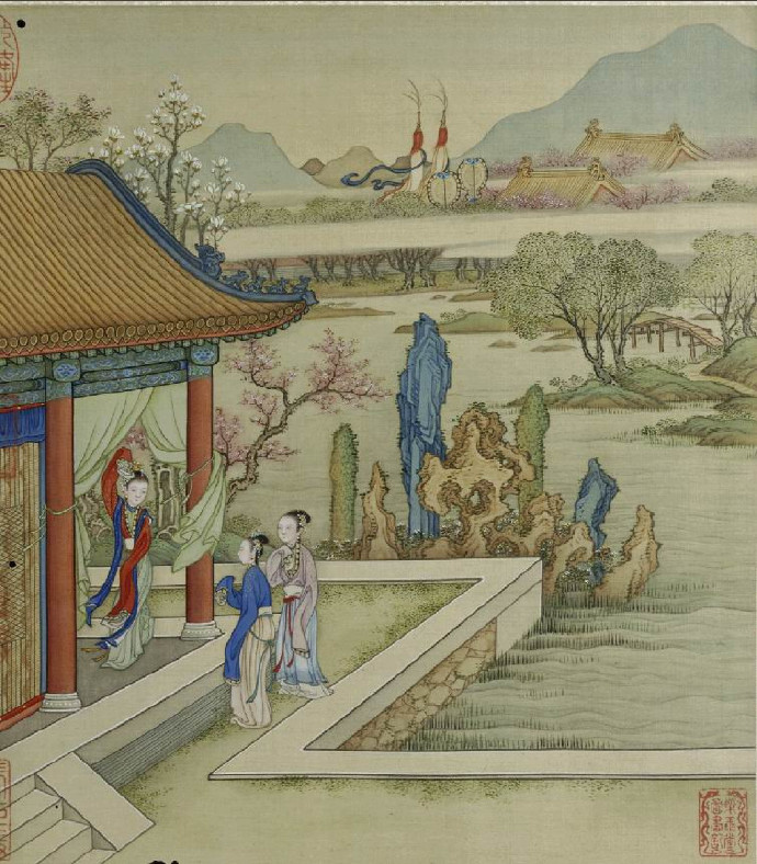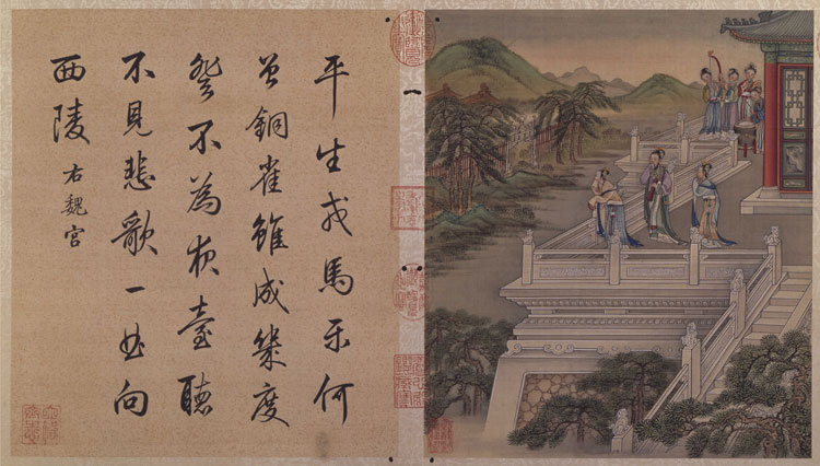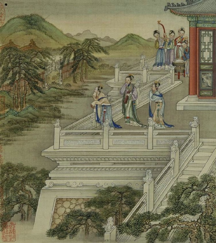 清 冷枚 绘,梁诗正 书《十宫词图》册(十开) 绢本 设色 每开纵33.1cm,横29.3cm。 本幅无作者款印。钤乾隆、嘉庆内府收藏诸印。 此套图册共10开,描绘历代贤德后妃或贵族女子的故事,和《养正图》册具有同样鲜明的教育意义。对题有梁诗正书写的弘历承继帝位前于雍正十三年(1735年)所作的诗句,与图画互为辉映。 由于图册以历代宫廷生活为题,故每幅画面均有对宫廷建筑的描绘,但因为作者只是宫廷画工,并不具备对前代建筑的了解与认知,同时历史人物画“成教化,助人伦”的政治功用也淡化了这些作为人物故事背景的历代宫廷建筑,使其更多地带有装饰性与程式化色彩,并没有呈现出不同时代的建筑风貌。值得注意的是,册中建筑的描绘均采用“海西画法”,冷枚作品中体现的这种画风特性,是在中国传统界画的基础上运用透视法增强画面的空间深度感并以明暗关系区分阴阳向背,说明曾为康熙皇帝所赏识的“海西法”在雍正、乾隆朝的宫廷建筑绘画中已被日渐欣赏和接受。