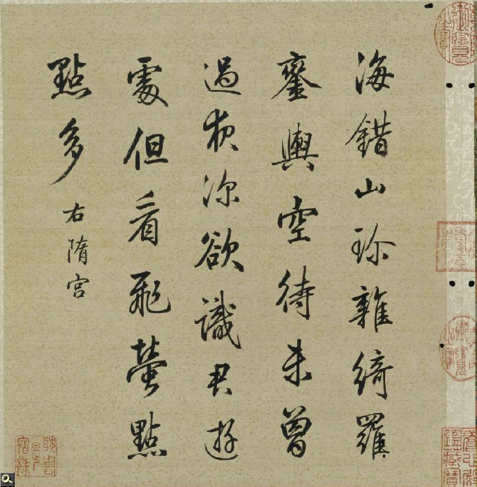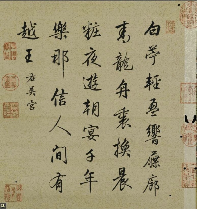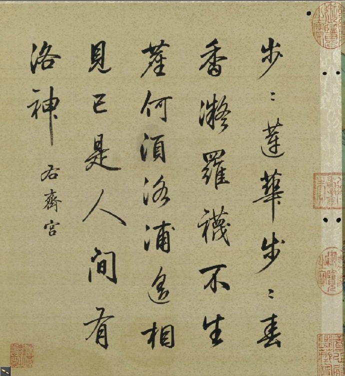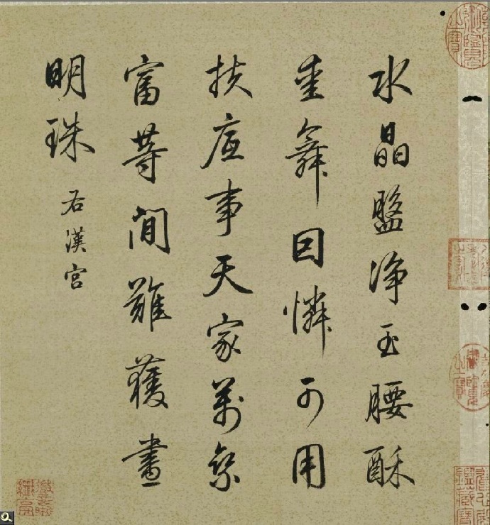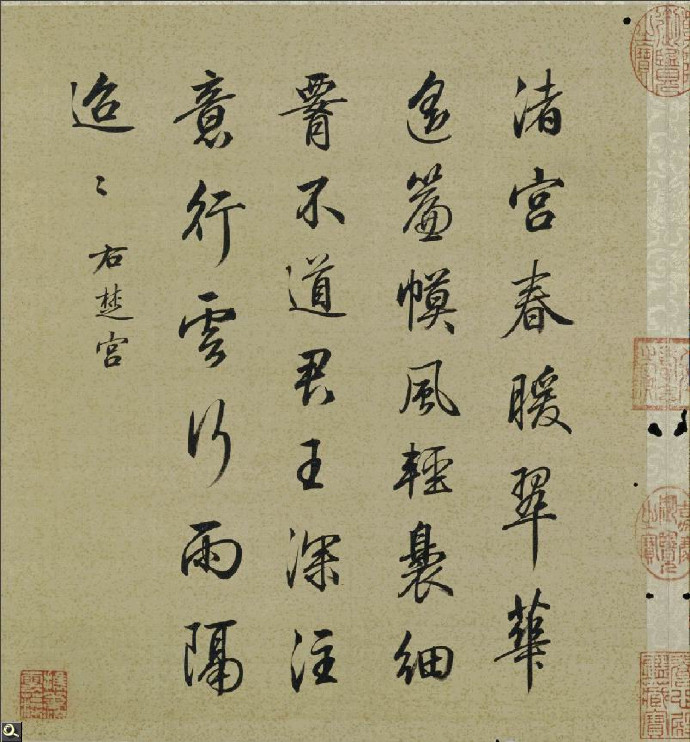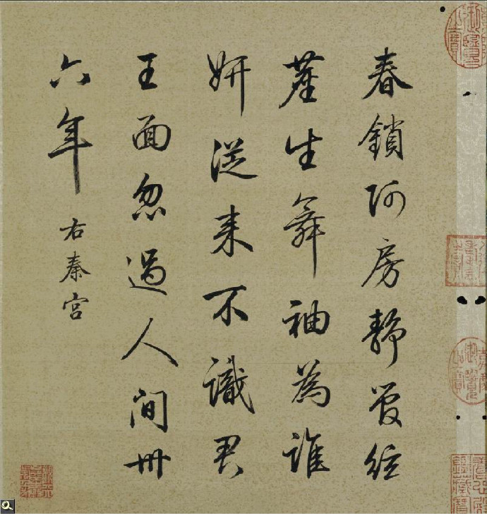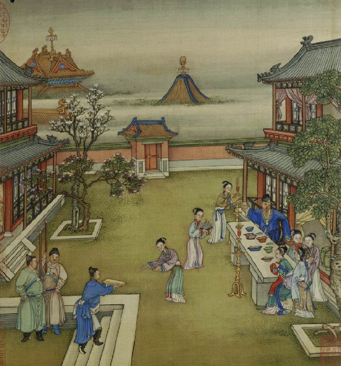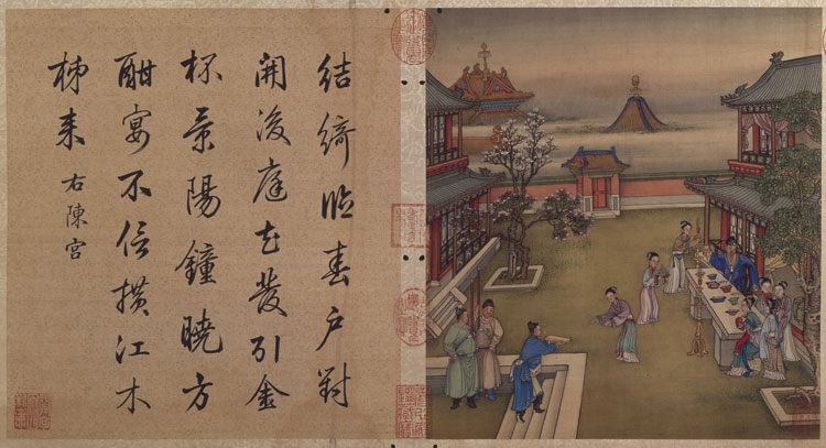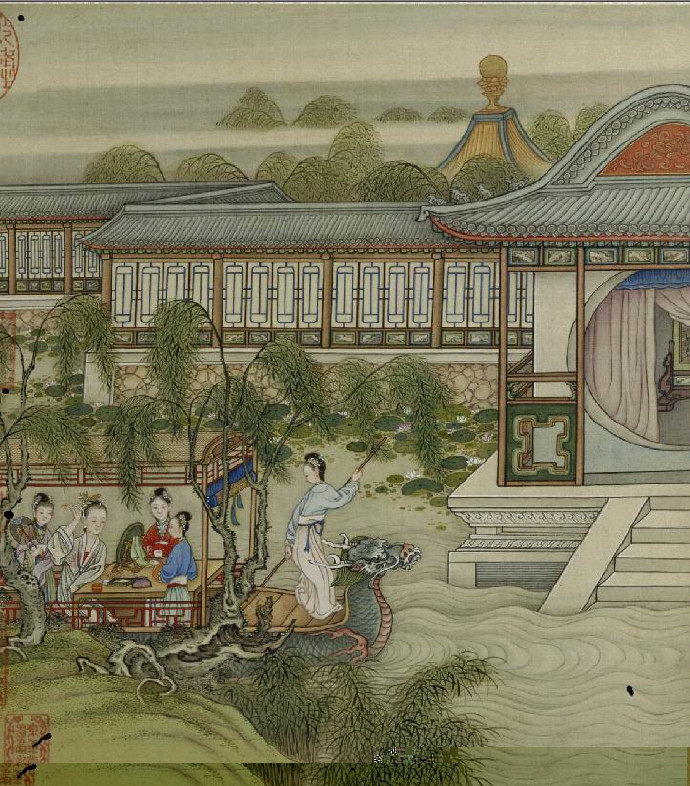 清 冷枚 绘,梁诗正 书《十宫词图》册(十开) 绢本 设色 每开纵33.1cm,横29.3cm。 本幅无作者款印。钤乾隆、嘉庆内府收藏诸印。 此套图册共10开,描绘历代贤德后妃或贵族女子的故事,和《养正图》册具有同样鲜明的教育意义。对题有梁诗正书写的弘历承继帝位前于雍正十三年(1735年)所作的诗句,与图画互为辉映。 由于图册以历代宫廷生活为题,故每幅画面均有对宫廷建筑的描绘,但因为作者只是宫廷画工,并不具备对前代建筑的了解与认知,同时历史人物画“成教化,助人伦”的政治功用也淡化了这些作为人物故事背景的历代宫廷建筑,使其更多地带有装饰性与程式化色彩,并没有呈现出不同时代的建筑风貌。值得注意的是,册中建筑的描绘均采用“海西画法”,冷枚作品中体现的这种画风特性,是在中国传统界画的基础上运用透视法增强画面的空间深度感并以明暗关系区分阴阳向背,说明曾为康熙皇帝所赏识的“海西法”在雍正、乾隆朝的宫廷建筑绘画中已被日渐欣赏和接受。