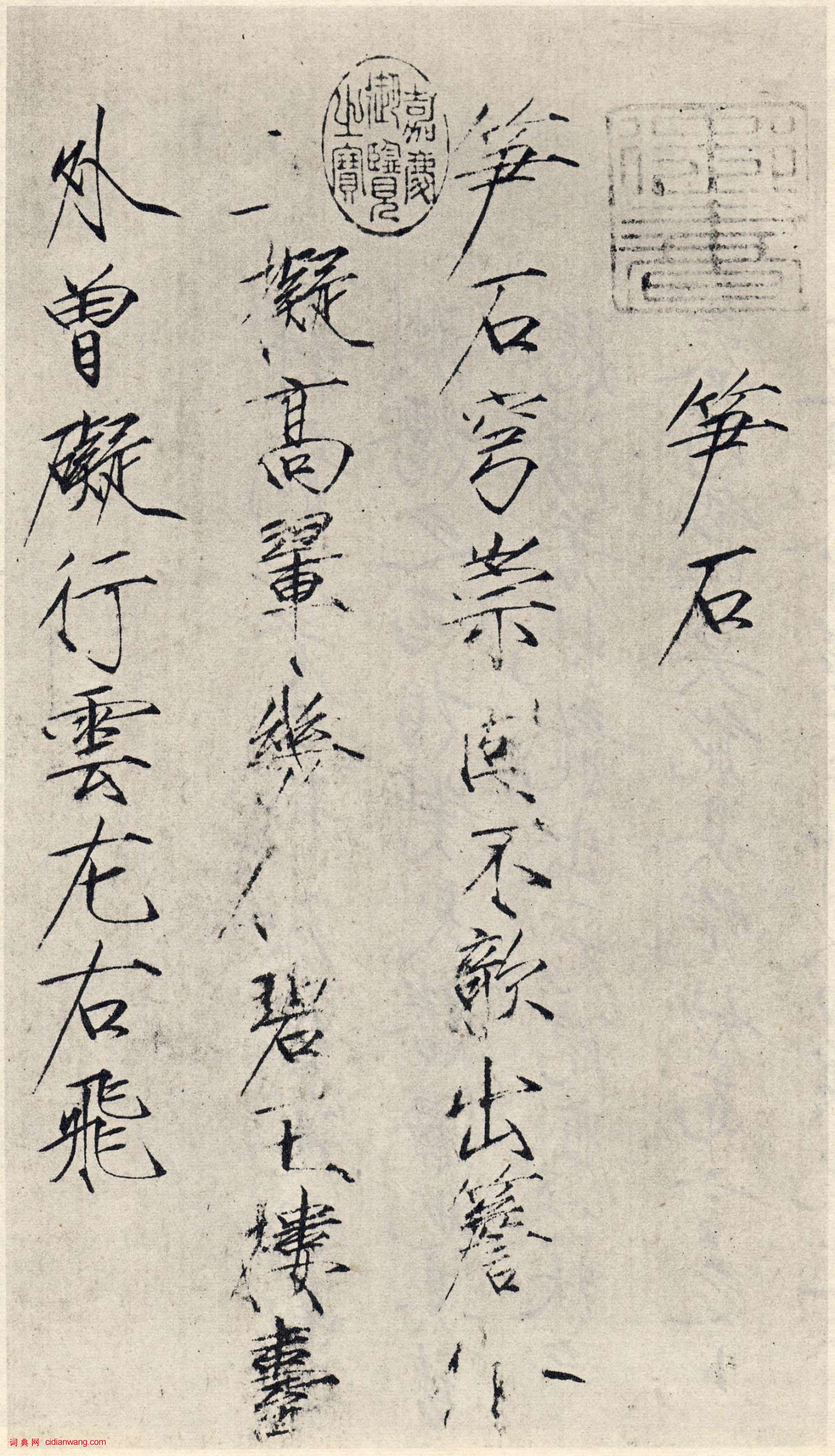 【释文】笋石:穹崇固不欹,出檐囗囗拟高晕。几囗 * 台外,曾碍行云左右飞