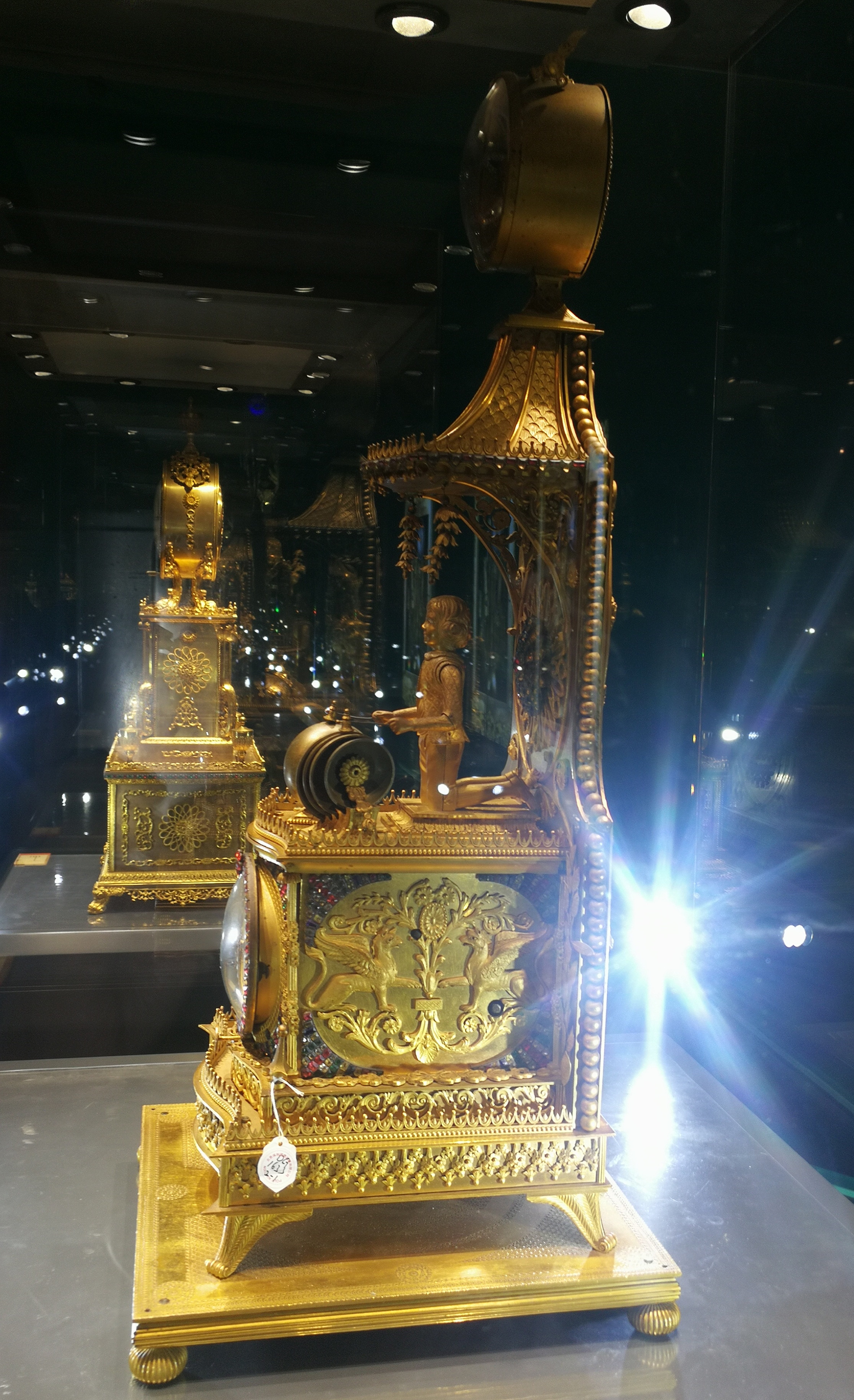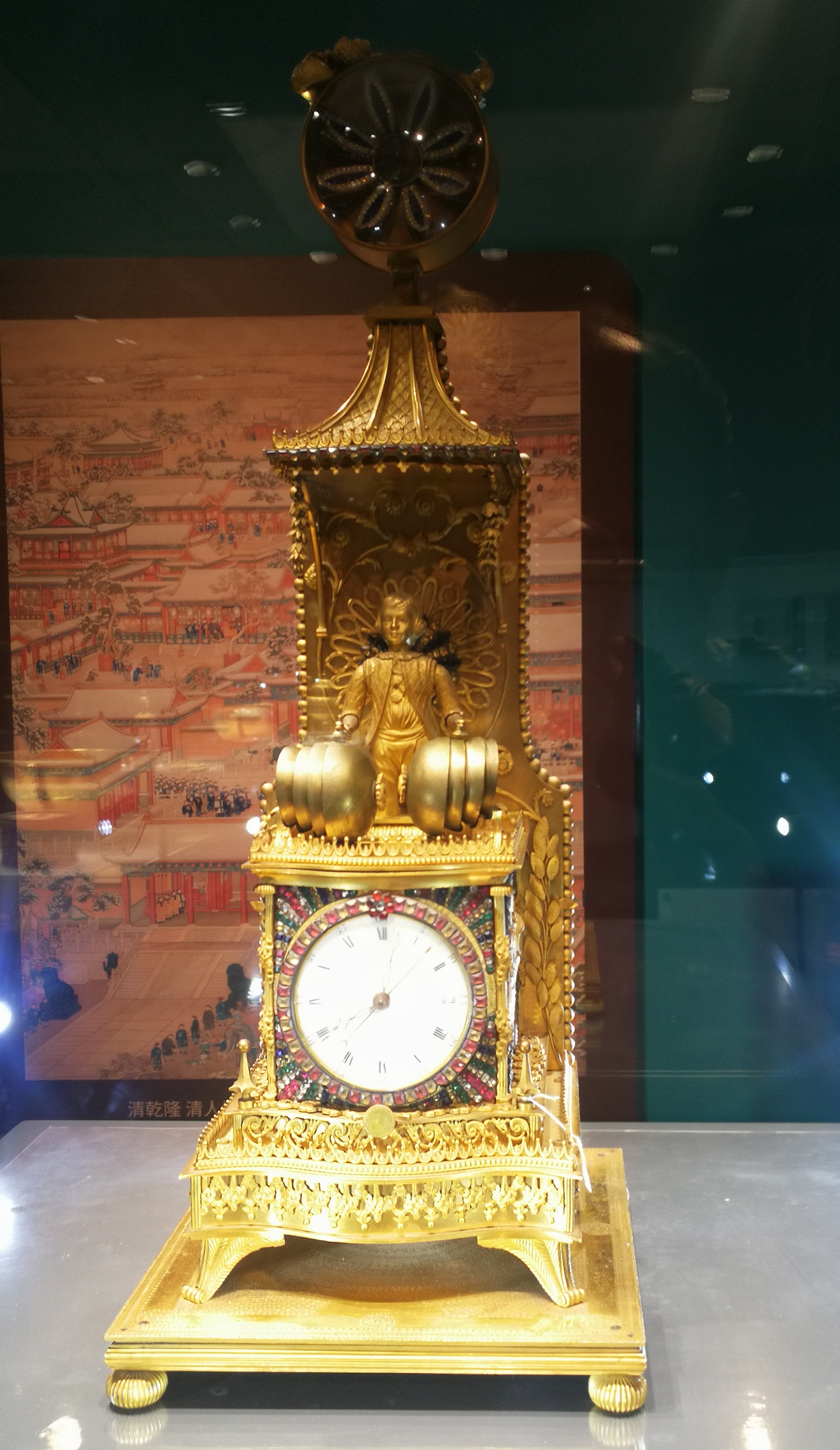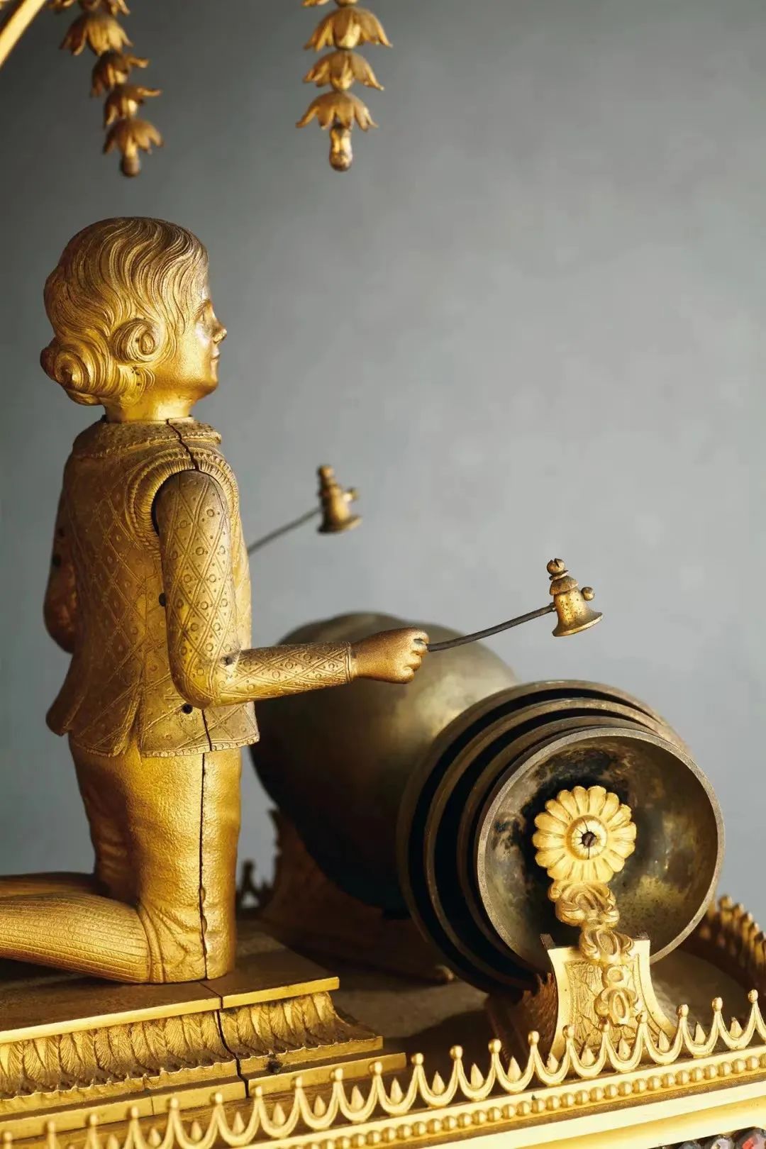 时钟以人物雕塑为主体的设计,多为乾隆中后期(1755-1795)采买的英国钟之特色。钟表师巧妙的将本属内部机芯的铃铛(报时与奏乐功能),安置在外观设计中,并以人偶转动手臂敲击的方式发出声响,童子双腿跪地,符合中国礼仪。同时辅以钟顶的转花。在听觉报时与奏乐之际,更增强了视觉欣赏的魅力,为此钟一大特色。