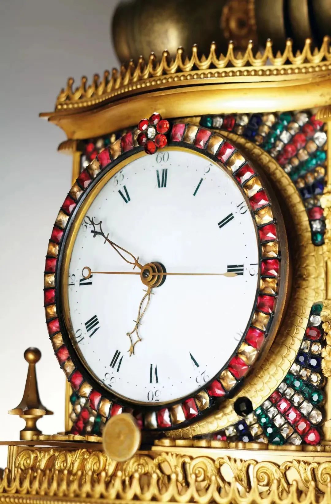 敲钟为中国传统的报时方法,而将其与自动机械结合在一起,于声音报时之外又具人偶奏乐的视觉冲击,可谓清高宗弘历庋藏钟表的旨趣。乾隆二十六年(1761),弘历曾下令如意馆画家艾启蒙(lgnatius Sickeltart)将打钟人物“改画西洋装饰起稿”。这一文献记载为研究带有打钟人的“宫廷钟表”提供了线索。