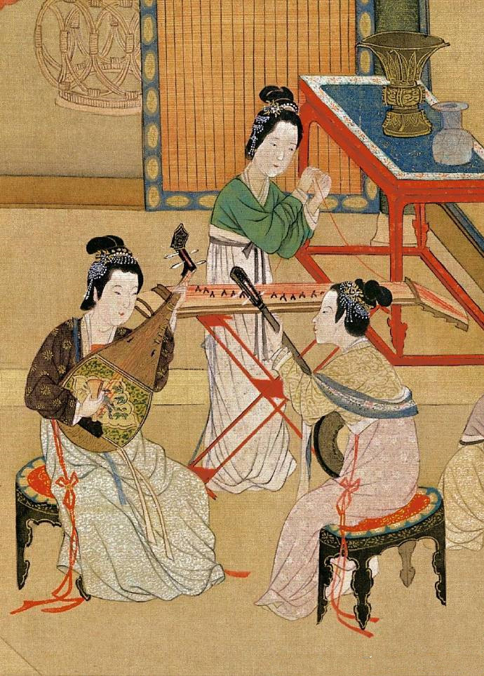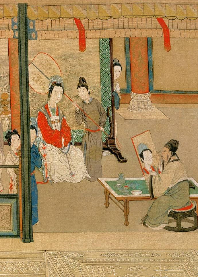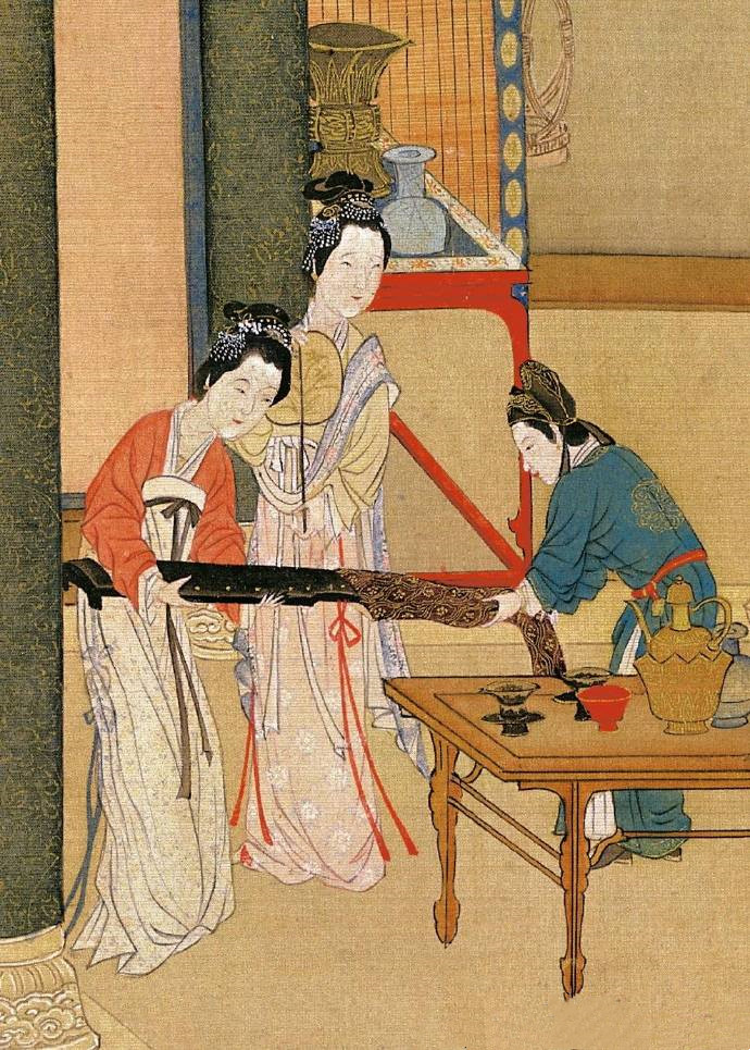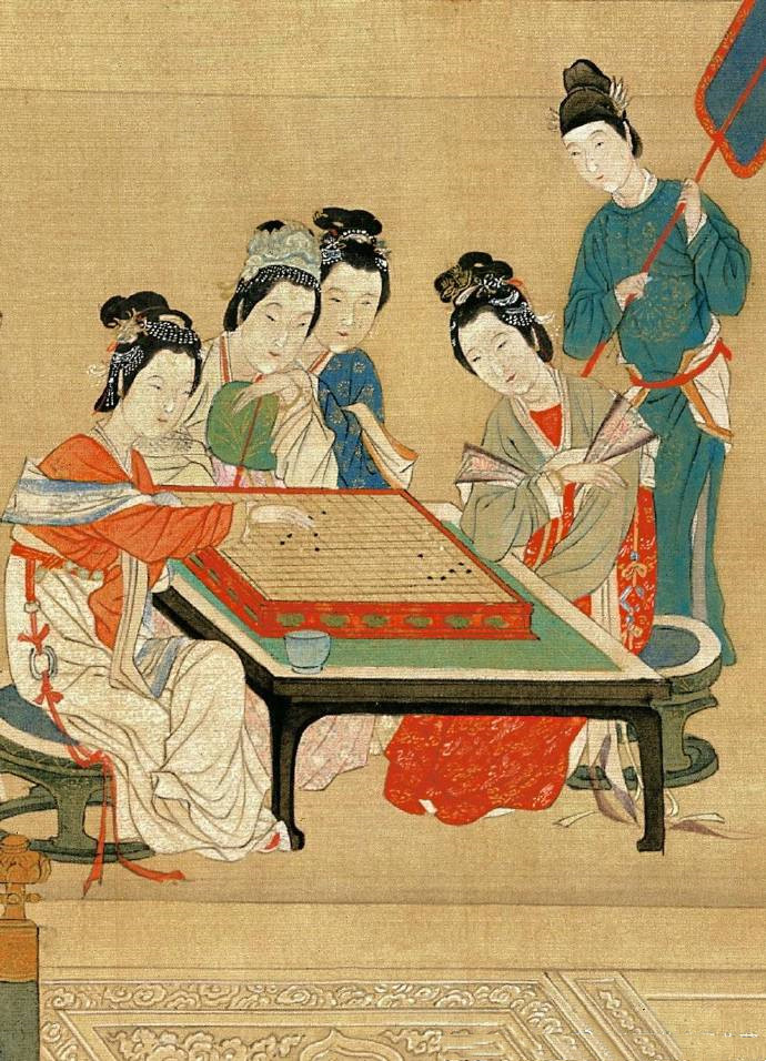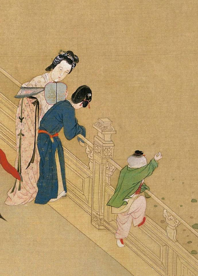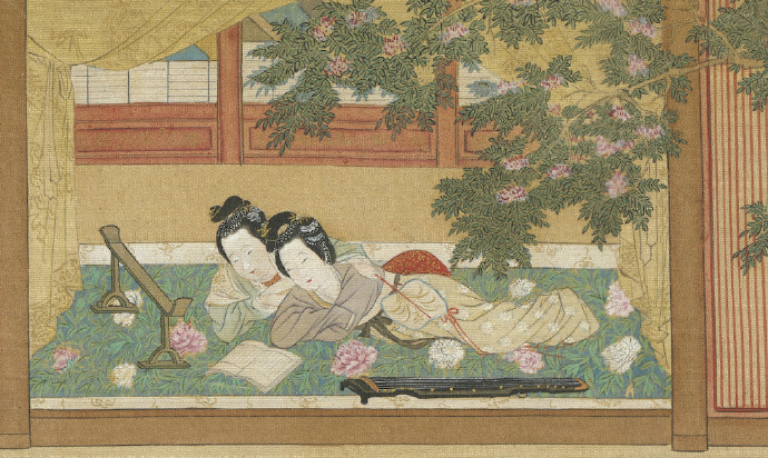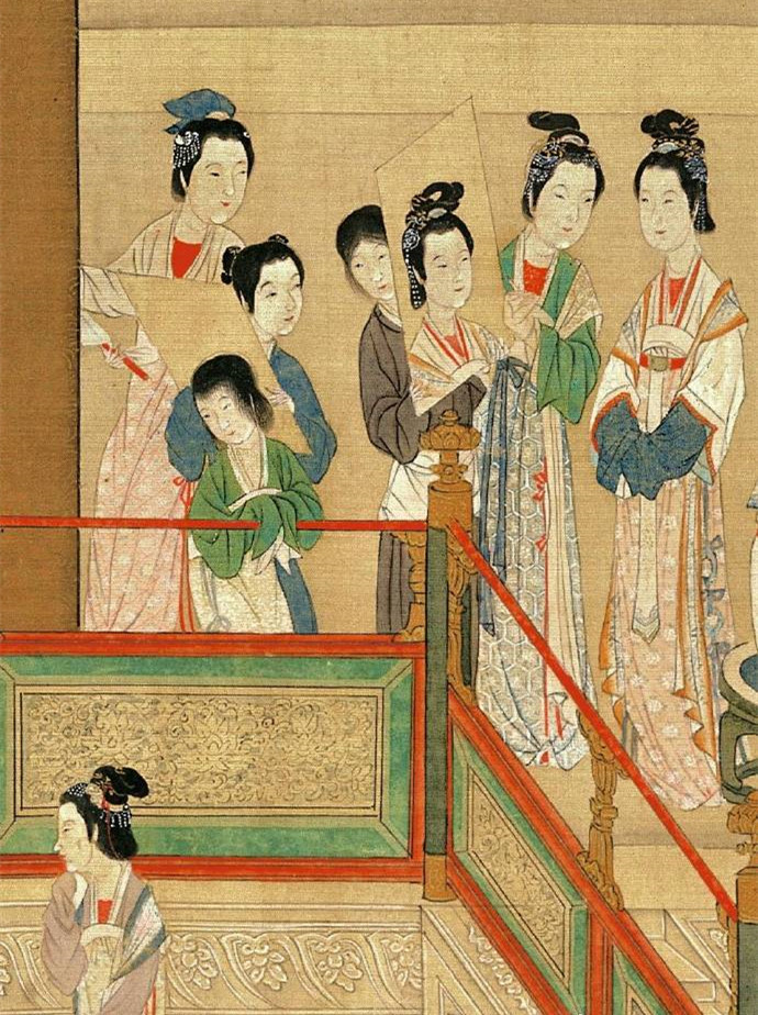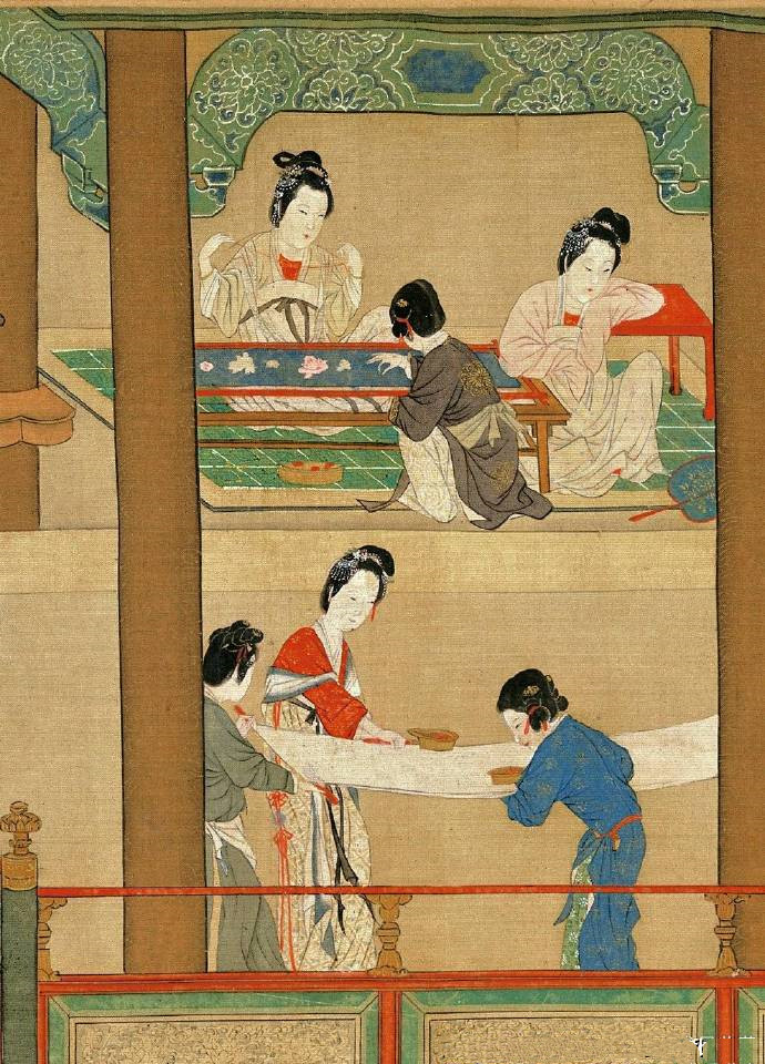 此画以春日晨曦中的宫廷为背景,描绘嫔妃的日常生活。此画为仇英平生得意之作,被誉为中国十大传世名画之一。绢本重彩,台北故宫博物院藏。画中所绘一百一十多人,提壶、摘花、持扇、扑蝶、浇花、斗草、弈棋、熨练、刺绣、弄乐......,放大看细部,发现竟有两个女子在草地上读书。不知读的是什么书。
