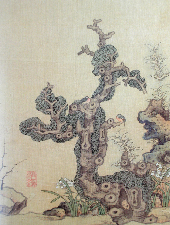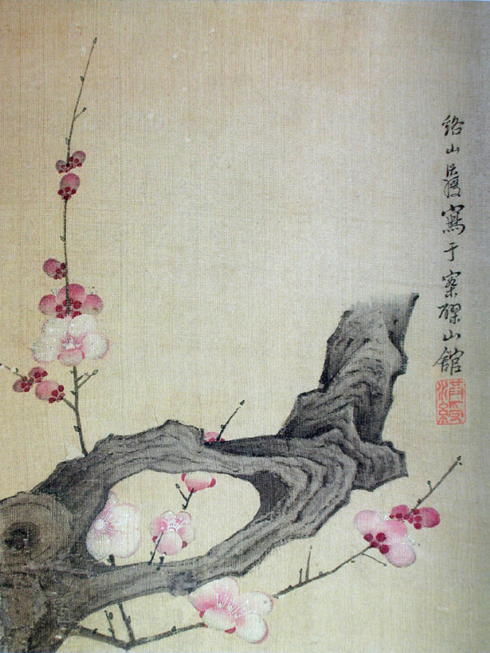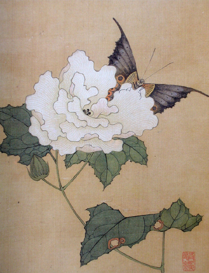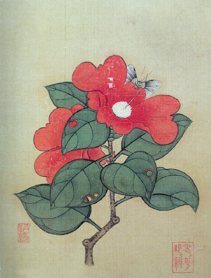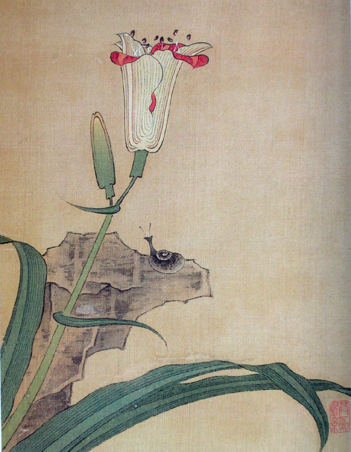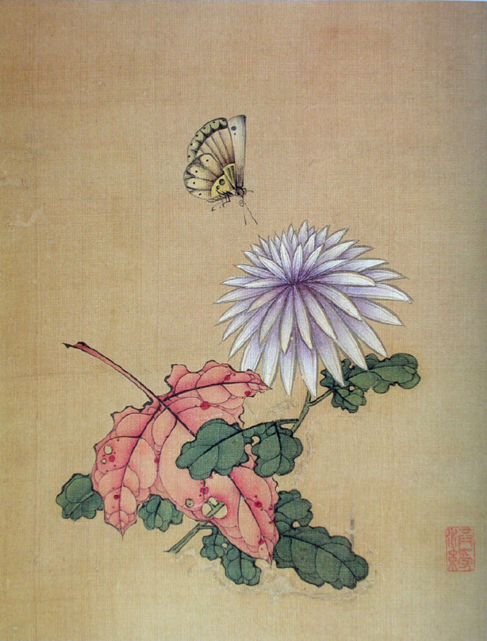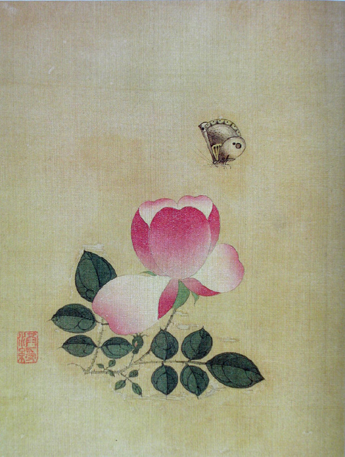 《花鸟草虫写生册》是明代绘画奇才陈洪绶难得一见的精品,共十二开,绢本设色,分绘茶花蝴蝶、桃花蛱蝶、萱花蜗牛、牡丹蛱蝶、蔷薇蝴蝶、紫菊蝴蝶、竹禽、水仙竹叶、古槐双禽、红果草虫、奇石、梅石等景物,款署:“溪山洪绶写于榕醪山馆”,每开俱有“洪绶”朱文长方印及清人孙均对题,册前有签条“陈章侯花鸟草虫写生,看篆楼珍藏,药房书签”,画后有崇恩、潘厚、潘景郑三题。