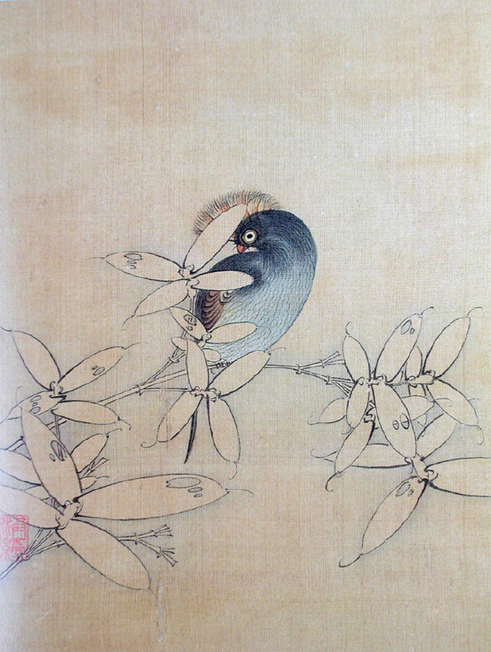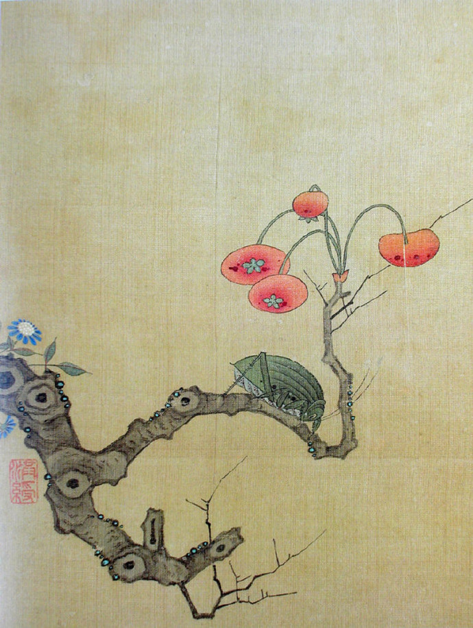 设色方面,此册也秉承了陈氏的一些习惯,比如画家喜欢用一些蓝色的小菊花作为画面的点缀,《红果草虫》这一开中的树干后就画有此种小菊花,画家巧妙地用这一点点蓝色与作为主题的红果对应,既点醒了画面,又丰富了层次。再如,陈洪绶在作双勾白描竹子的时候,为了突出竹叶,常喜欢沿着勾勒的线条的外沿渲染一层淡淡的花青色,这种绘画方式在陈洪绶的画作中可谓比比皆是。该册页曾拍卖2979.2万元。