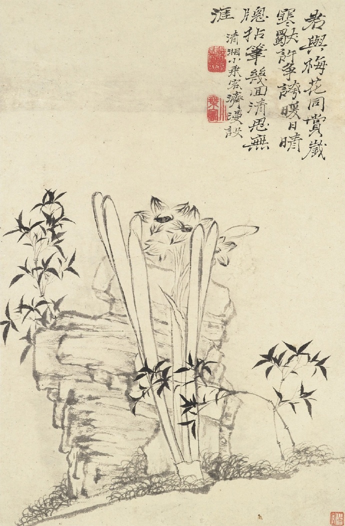 题识:春兰夏蕙年年赏,忙煞花奴品石前。莫把真香比凡卉,悠然空谷至今传。三春谁不花前语,岂是王香写得完。欲赠伊人凭斗墨,拈来指上四时看。清湘老人济。