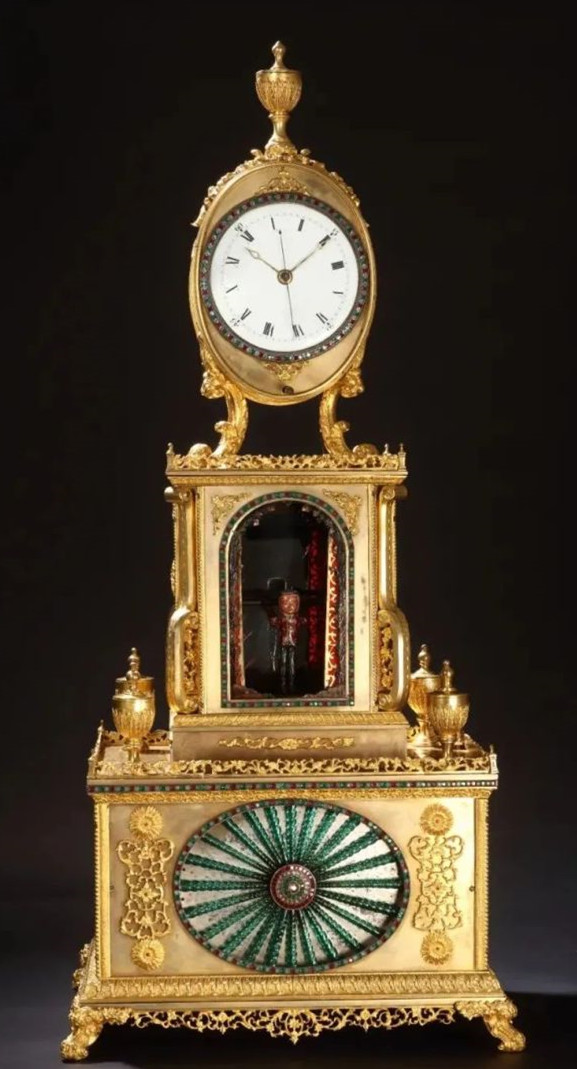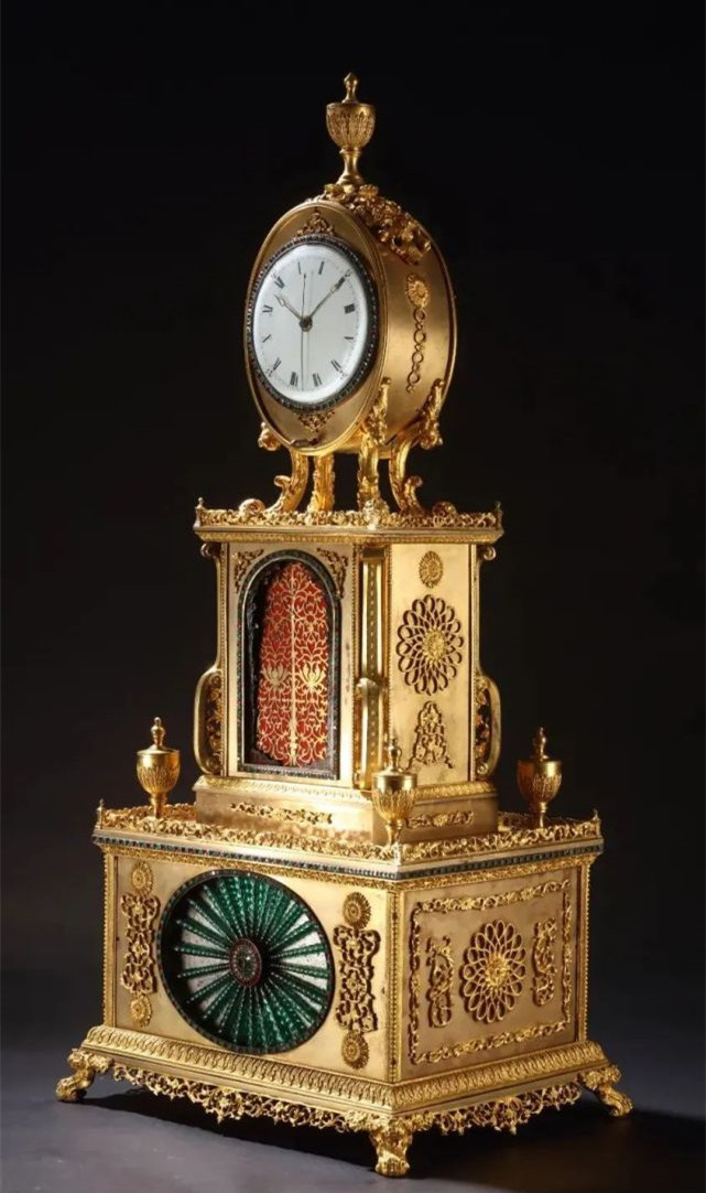 整体分为三层。长方形的底层由四个卷叶足支撑,中间具有椭圆形的开光,其中有绿色的水法,以放射状安装而成。边框镶嵌有红色、绿色和白色料石。上方的四角具有新古典主义风格的瓶形。中层采用凸出的平台,其侧面采用贴花设计,与底层的工艺相匹配。正面有一个拱形设计,带有两扇滑动的丝质背面镂花门。开门时会显示出一个彩绘精美的杂技人偶。上层为椭圆形设计并装有时钟盘面,并且由四个卷叶足高高托起。