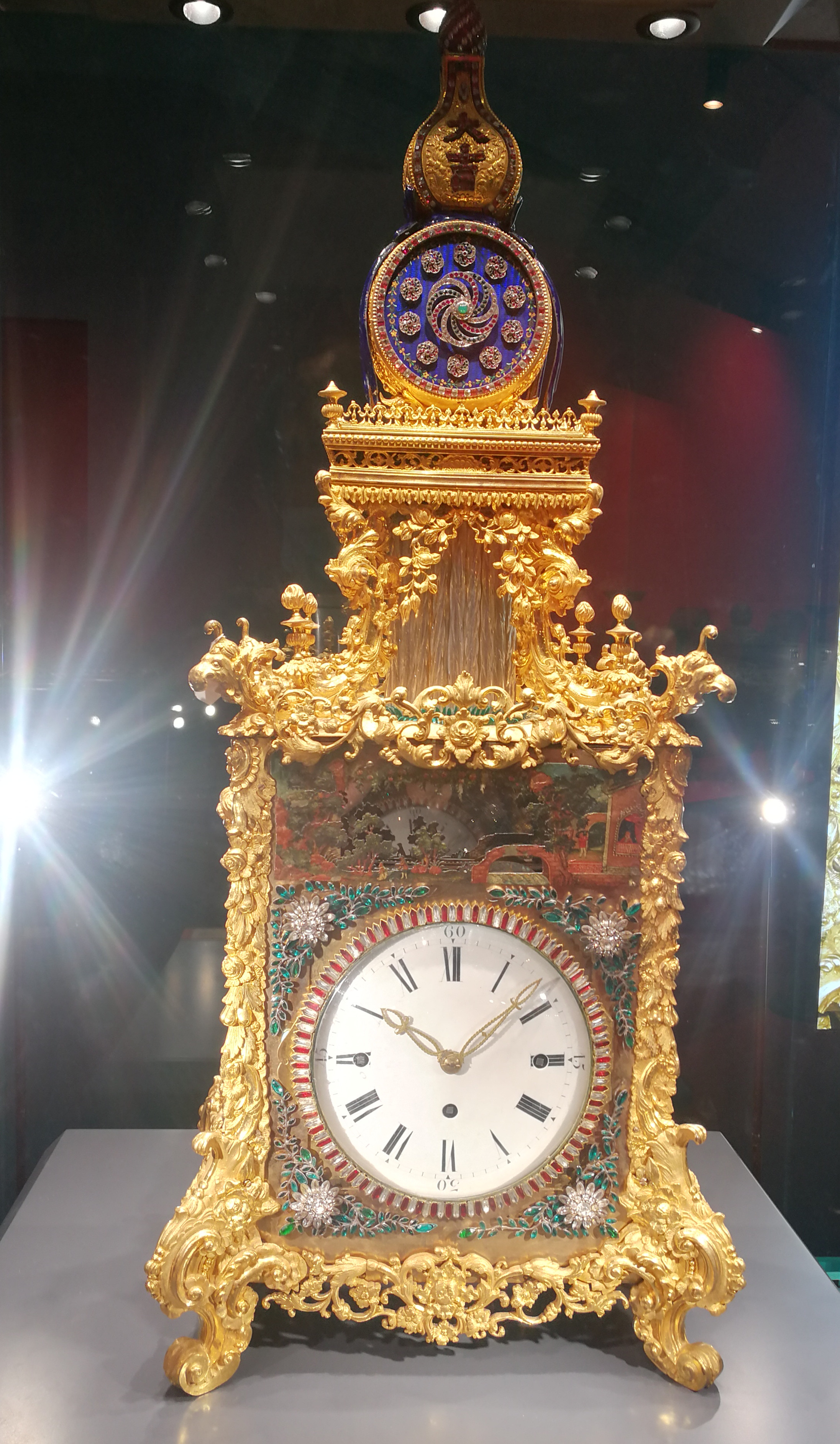 通体共分三层。上部为铜鎏金珐琅嵌料石大吉葫芦造型,中部为水法柱,下部及为表身主体,近似方形。表盘四周镶嵌各色料石,指针镂空勾勒成欧式教堂塔尖的样式。表盘上方开光内设“胡人献宝”。这是一件“活动”的艺术品:伴随着打点时优雅的音乐,几个身着欧洲服饰的小人在油漆彩画的布景箱内飞快跑动;雕刻精细的铜鎏金花叶式柱内,水法景观缓缓转动,犹如一帘瀑布;而大吉葫芦腹部中间的一朵大转花、周围十朵小转花以及顶部的菠萝花,也在乐曲中悠然旋转,令人目不暇接。整个铜鎏金框架布满涡卷毛莨叶雕饰,底部四足上均有涡卷叶饰纹样与上部呼应。钟侧立柱雕刻精美,深及三寸,繁复的蕃花和葡萄图案与简洁的中国柱式相去甚远,应为迎合乾隆繁复新奇的审美偏好。