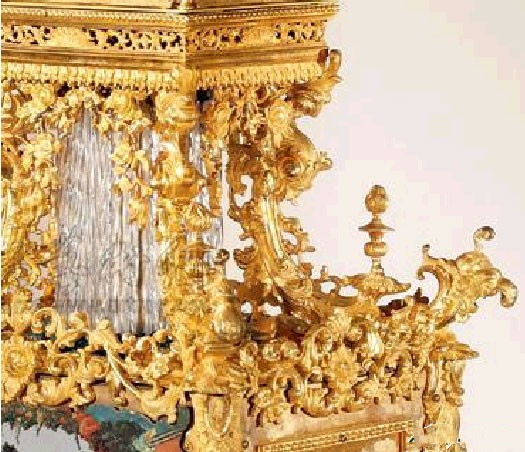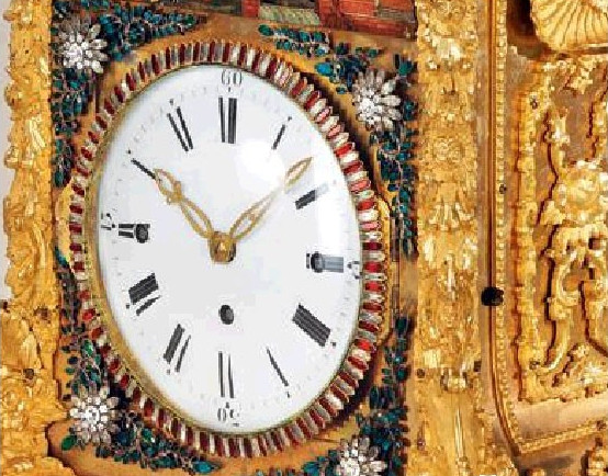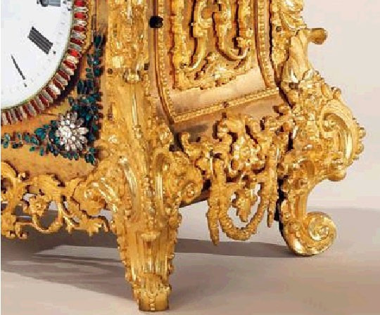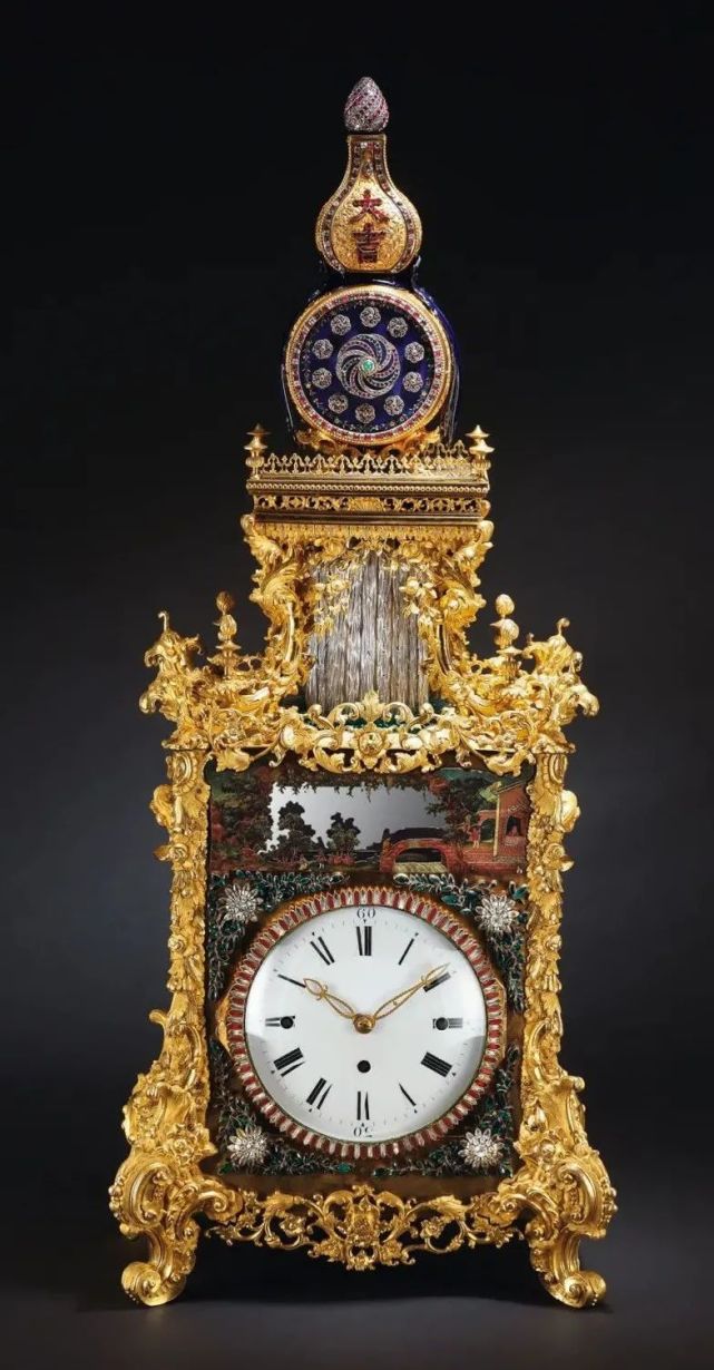 此件铜鎏金转花转水法大吉葫芦钟,借鉴了欧洲精良的钟表工艺,华丽绝伦的外观融合浓郁的西洋风格和东方的吉祥寓意,并呈现出惊人的和谐统一。上部葫芦腹部转花的底衬板和葫芦中间的带饰采用的珐琅镶嵌工艺,鲜艳透明,有黄、绿、蓝等颜色,装饰花纹细密繁褥,层层叠烧,制作精细。钟盘边缘、钟盘外面四角的料石花、大吉葫芦边缘以及顶部的菠萝花又镶嵌料石,表盘正中更嵌以饱满圆形浓绿翡翠,更具东方神韵。