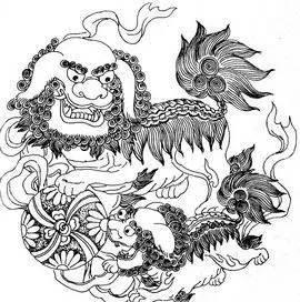 由两只狮子和一个绣球构图,狮子为古代汉族人民心目中的瑞兽,绣球是用纺织品仿绣球花制作的圆球,被视为吉祥喜庆之物。