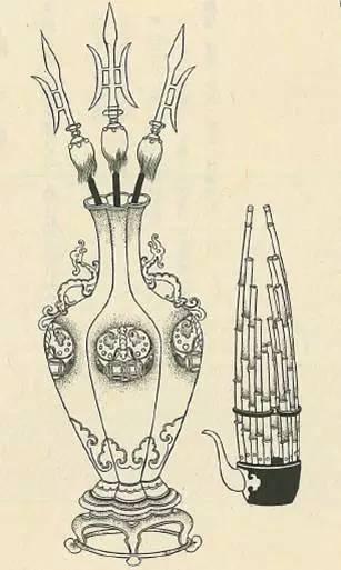 一般是以一花瓶内插三支短戟,以谐音"瓶升三戟"。"瓶"与"平"、"笙"与"升"、 "戟"与"级"同音,以此寓意。