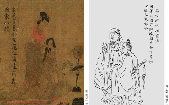 这种描法要求把篆书笔法融于画法之中,似篆书般圆匀遒劲的笔法,以外柔内刚的线条来表现人物的衣纹。如明代丁云鹏的《补纳图》,画中衣纹线条墨色秀润简劲,用线简洁,细劲平直,很好地体现了外柔内刚的衣纹特征。