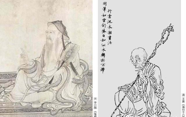 此描法宜中锋用笔,笔法如行云流水,活泼飞动,有起有倒。此法以李公麟的描法最为典型。元代汤垕《画鉴》中说:“(李伯时)惟临摹古画用绢素着色,笔法如行云流水,有起倒。”如李公麟的《免胄图》,迎风招展的旗帜和土兵身上软质的罩衫,线条流畅,笔意清新,如行云流水,舒卷自如。又如他的《维摩演教图》,所画人物的衣纹线条如行云流水,加上画中墨色浓淡的变化,使画中人物表现出圣洁出尘的风采。