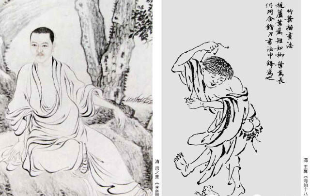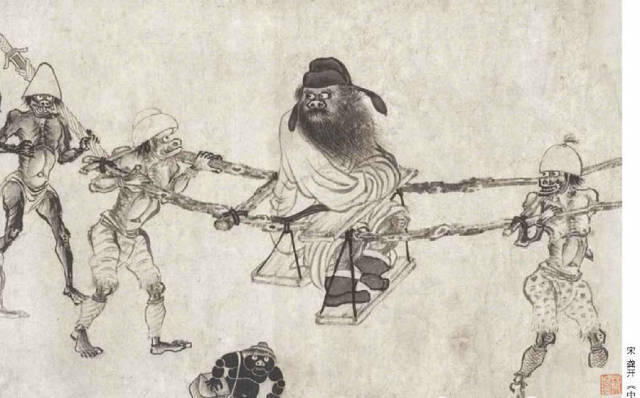 枯柴描与减笔描在用笔上并无多大区别,只是前者渴笔较多,后者干湿并用。如宋代龚开的《中山出游图》,钟馗衣纹都用偏锋,渴笔画出,在线叉开时还会产生飞白的效果,一如枯柴高悬。明代画家多采用这种描法,如吴伟、张路、周臣等画中人物服饰中的线条基本上属于这一类型。