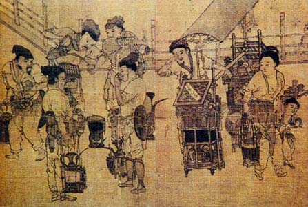 《茗园赌市图》(此画藏台北故宫博物院)是《卢仝烹茶图》的姐妹篇。画以人物为主。画中茶贩有注水点茶的,有提壶的,有举杯品茶的。右前方有一挑茶担卖茶小贩,停肩观看,还有一妇人一手拎壶另一手携小孩,边走边看“斗茶”。画中有男人、女人,老人、壮年、儿童,人人有特色表情,眼光集于茶贩们的“斗茶”,个个形象生动逼真,把宋代街头民间茗园“赌市”的情景淋漓尽致地描绘在世人面前。