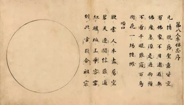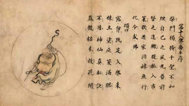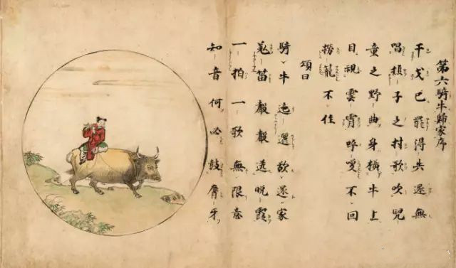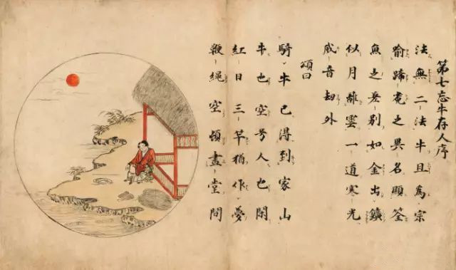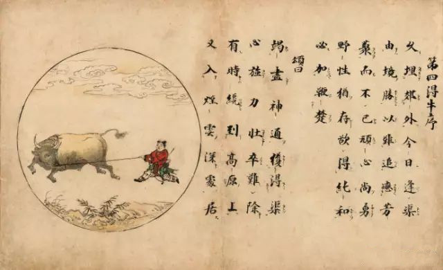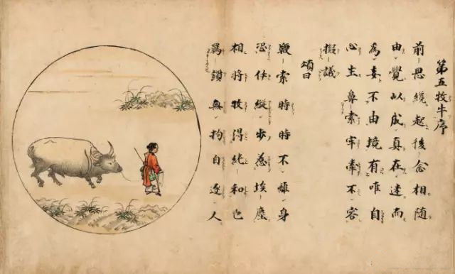 【十三世纪禅宗十牛图颂】禅宗用图画、文字将开悟的过程和在各个阶段的体验表现出来,系统地描绘出由修行而开悟而入世的心路历程,这就是著名的牧牛图及其图颂。《牧牛图》用十幅图画描绘牧牛的过程,亦称《十牛图》。长卷有图、颂(诗)、文(着语),表示了从寻牛觅心到归家稳坐的过程,以阐示修行的方法与顺序。《十牛图颂》一卷,全称《住鼎州梁山廓庵和尚十牛图颂并序》,《十牛图》与《信心铭》、《证道歌》、《坐禅仪》合印,称四部录,在禅林影响尤大。十牛图用牧人和牛的形象,象征修行者驯服心牛,以重现本来面目