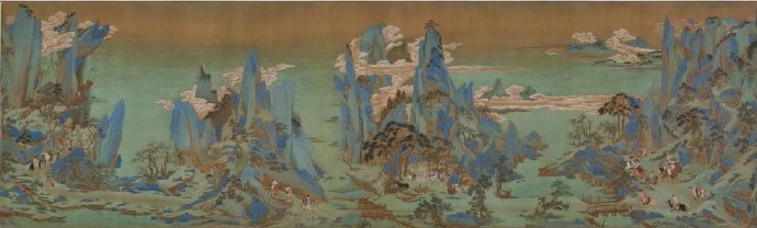 文徵明 书法题跋仇英《蜀川佳丽图》卷,绢本,青绿设色,54.9×973.3cm,弗利尔美术馆藏。