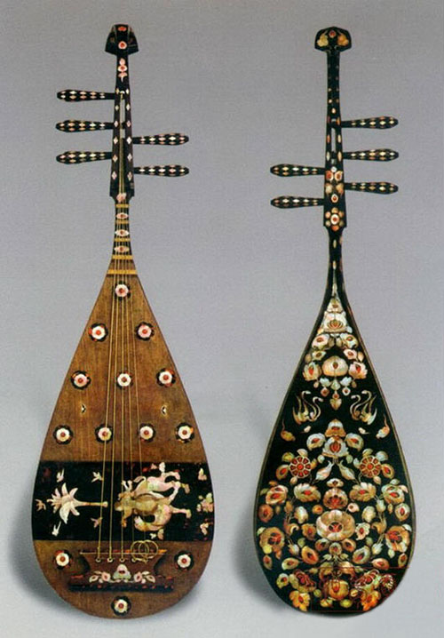 这个琵琶是不折不扣的神品,琵琶一般都是四弦,而这个是传世唯一一个五弦的琵琶。这个乐器极度华丽,唐代的螺钿镶嵌技巧被它发挥到了极致,世界上现存的能表现大唐盛世繁华的文物,最典型的大概就是这件了。这件乐器是日本圣武天皇的收藏,他死后,生前用过的宝物都被藏在了奈良东大寺的正仓院里,一千多年无人惊扰,仓库里面留下了不知道多少奇珍异宝,光是极品乐器就有四五件之多,而这件是其中的第一名品,是日本皇家收藏的最珍贵的宝物。