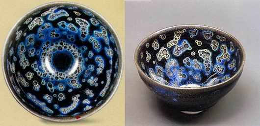 这是一个神异的文物,其实就单品而论,它完全可以排到第一的。这个茶碗是宋代黑釉的建盏(福建建阳窑),是宋人斗茶用的,但是这个样子的,莫说举世无双,就连考古发现的大量瓷片中,也没发现任何一个类似的。日本人形容这个碗,都是用“碗中宇宙”这种词,说里面仿佛是深夜海边看到的星空,高深莫测。这种曜变天目碗据说有两只,流传到日本之后,立马就都成了王公贵族争相追捧的宝物,其中一只被织田信长所得,毁于本能寺之变,剩下一只是德川家康传下来的秘宝,后来被三代将军家光赐给了春日局(有兴趣的可以去查查这些人的来头,都是日本史上最出名的人物了)。这个碗在明治年间被三菱总裁岩崎小弥太所得,但是他说,这是天下的名器,不是我配用的,所以一生都没用它喝过茶。