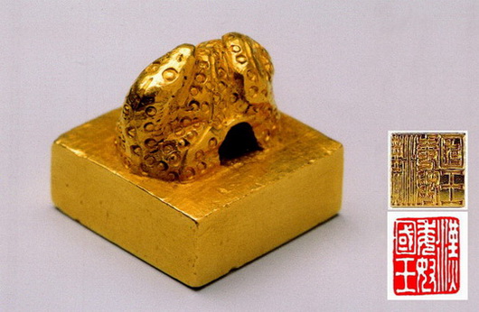 《后汉书光武帝本纪》和《后汉书东夷传》中记“建武中元二年(公元57年)倭奴国奉贡朝贺,使人自称大夫,光武赐以印缓。”这枚金印后来不知所踪,直到1784年,才在九州的福冈,名叫秀治和喜平的二位佃农,在耕作挖沟时偶然发现。金印印面正方形,边长2.3厘米,印台高约0.9厘米,台上附蛇形钮,通体高约2.2厘米,上面刻有“汉委奴国王”字样,清晰的说明了倭国是汉朝的附属,是中日外交史上最珍贵的文物。