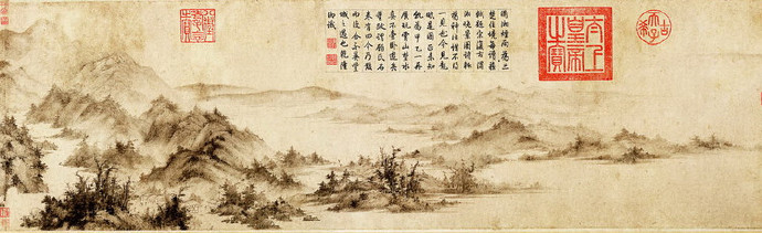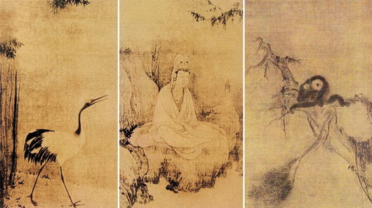 这套图画三幅一组,是宋代禅宗画的极品,藏于京都大德寺,每年十月的第二个周日展出一次。牧溪是南宋四川人,曾因反对贾似道而遭通缉。此人画法极具禅意,每幅画皆随笔点墨而成,意思简当,不费装缀。最经典的《烟寺晚钟图》,就是几笔点就,简直就是神来之作。这组观音猿鹤图是著名的禅门公案图,除了观音之外,猿鹤的含义根本无从得知,特别是那只母猿,怀抱幼崽,情同人类,却又茫然直视,不知何解,仿佛画家用画笔画出了一幅充满禅机的问卷,让世人回答。