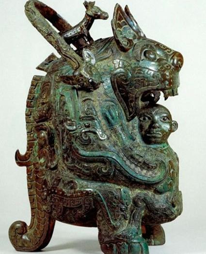 虎食人卣是中国商代晚期的青铜器珍品,也是日本收藏的中国青铜器中最重要的两件之一(另一件为永青文库的狩猎纹铜镜),通高35.7厘米,造型取踞虎与人相抱的姿态,立意奇特。它和许多出土于湖南的商代后期的青铜器一样,纹饰繁缛,以人兽为主题,表现怪异的思想。这件作品究竟是要表现老虎吃人的凶猛,还是人兽和谐的天人合一,历来说法不一,但可以确定的是,商代青铜器中很少有比这件更奇异复杂的了。