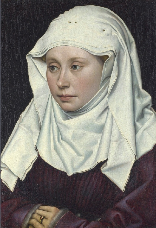 《女子肖像》,约1420-1430年,40×28厘米)《女子肖像》是罗伯特·康平是一幅重要的肖像作品。他在画面中用深色的背景和浅色的头巾产生强烈的对比效果,精细的明暗光影的描绘,使得人物有了可信的空间感和现实感,营造出强烈的视觉效果。画中人物面部栩栩如生,白色头巾的织物的质感和女子面部肌肤的质感是画家着意描绘的对象,充分显示了画家对光影效果的把握能力。康平以冷峻的理性来再现人物的面部特征,把一个普通人的内心世界不加修饰地呈现出来。以前的“画像”总是用于一些特别的场合,而康平一改传统的习惯,将肖像独立出来,成为比较严格意义上的“肖像画”。可以说,是罗伯特·康平创立了“人物肖像画”。凡·德尔·韦登继承发展了康平的这种新的人物画法,而被誉为“表现人类情感的大师”。