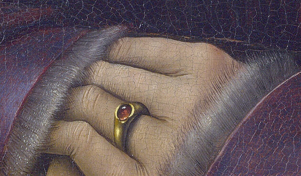 如果仔细观看,可以发现很多有意义的细节。她的头上有一根发髻一样的针状物,把头巾和头发别在一起,防止头发散开,体现了她对自己仪表的严格要求。这种克制还体现在她微皱的眉头、不苟言笑的表情、紧抿的嘴唇、从耳朵到下巴紧紧包裹的头巾,还有紧扣在一起的双手。观者几乎可以想象她跪在耶稣像前祈祷的样子。