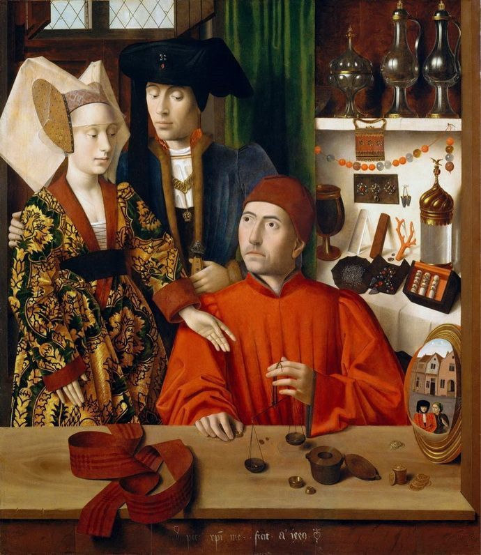 金匠铺里的三个人,一对情侣和金匠,女人指着金匠手中天平里称量的戒指,要完成这次交易。右侧一个凸面镜反射出两个青年和一只猎鹰(傲慢贪婪的象征),画框外是不尽人意的世界,画框内是美德平衡的呈现。