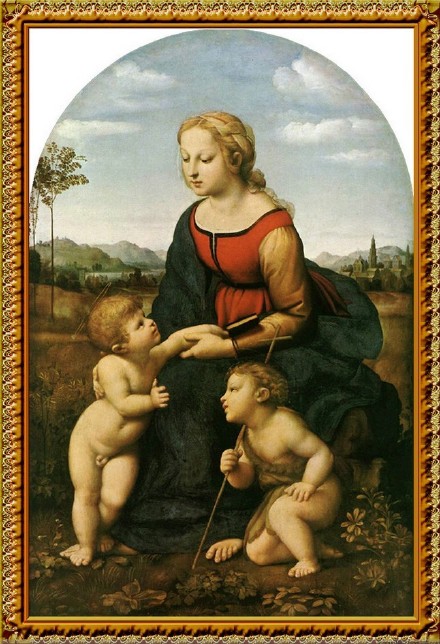 拉斐尔,那个在年轻时就离开世界的天才,虽然他的画中,没有达·芬奇的微妙精细,也没有米开朗其罗的刚劲有力,但是他的画中,闪动着人性的光辉,圣母在他的笔下,高贵于平凡、美丽于安静,甚至有点小家碧玉般的羞涩和单纯。在他的画中,抖落着生活的轻快。