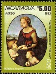 尼加拉瓜邮政于1983年9月15日发行了一套七枚的“画家拉斐尔(1483-1517)诞生500周年,绘画作品”纪念绘画邮票,其中第六枚就是画家的著名作品《花园里的圣母》,见第一页原画与原画右上角的同题材邮票图案。