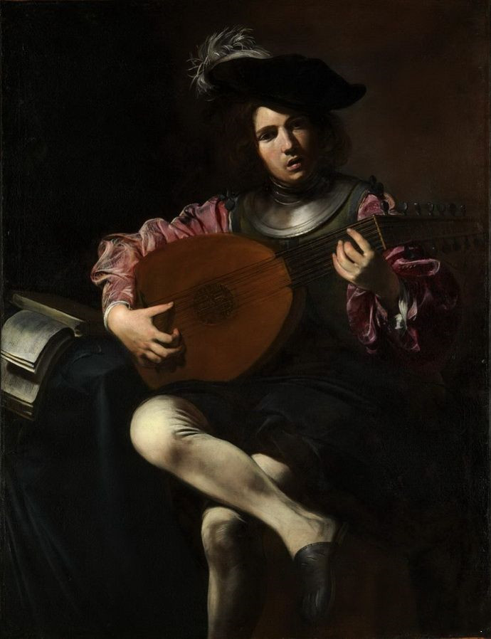 瓦伦丁是卡拉瓦乔的追随者中最伟大的法国画家,也是十七世纪罗马一位杰出的艺术家,他的整个创作时期都是在罗马度过的。他最常画的主题总与寻欢作乐有关,如奏乐、饮酒和算命等。这幅画《The Lute Player》中,一位富裕的士兵唱着情歌,这在瓦伦丁的所有作品中都是独一无二的。它可能象征瓦伦丁的绰号“阿马多尔”(西班牙语“爱情男孩”之意),瓦伦丁于1624年在罗马的时候给自己取了这个绰号,那年他加入了一个外国艺术家协会,叫做“同羽鸟”(Bentveughels)。瓦伦丁去世时年纪尚轻,正值其名声最鼎盛的时候,只留下区区几件作品。作者: 简·德·布伦·瓦伦汀(jean de boulogne valentin 1591-1632),法国画家。年轻时便赴意大利,他擅用黑色画出浓重阴影,并把乐师、卫兵、赌徒、吉普赛女人放入其中。《有算命者参加的聚会》(1628)、《音乐会》等画中的浓郁生活气息和在人们心中激起的美妙质朴印象是无以伦比的。瓦伦汀是卡拉瓦乔的追随者之一,作品风格有很强的模仿卡拉瓦乔的痕迹。