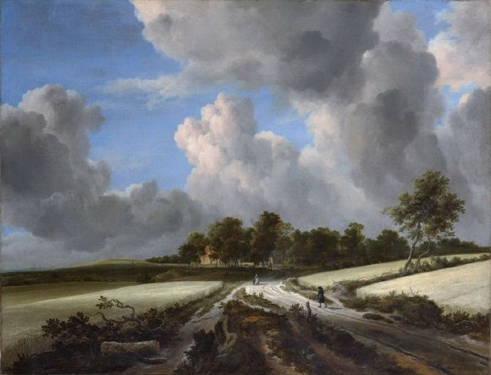 这幅《Wheat Fields》描绘的是云层滚滚的天空下的田野。画中地平线很低,天空面积巨大,略显厚重,具有倾压之势。天空下的树木、道路沉暗苍郁,而道路两边的麦田却是一片金黄。整幅画面对比强烈,对云的描绘极具神采,有一种苍茫雄浑之势。画中的人物,在天空巨大的穹顶下和广袤的大地上显得那么的渺小,象征着人类所做的一切努力最终将会回到自然力的控制之下。在画家的作品中这种对强大的大自然的崇拜和画家内心对自然美近乎忧郁的表达,一直伴随他的一生。作者: 雅各布·凡·雷斯达尔(Jacob van Ruisdael,1628-1682),又译为鲁伊斯达尔,是17世纪最著名的荷兰风景画家,也是荷兰古典主义风景画的先驱,在其后的两个世纪里,他的作品也仍然广受艺术家和作家的高度赞颂。他出生于哈勒姆一个小有名气的画家家庭,其叔父所罗门·雷斯达尔也是一位风景画大师,善于表现荷兰大平原上的畜群,充满银灰色调子的多云的天空。雷斯达尔在叔父的影响下,20岁以前就自成一家了。他早期创作以凝重见长,写实功力深厚。1648年成为哈莱姆画家行会的成员。这时期画的《林中小屋》表明他是17世纪前期荷兰风景画写实传统的继承者。之后,其画风越来越洒脱,对自然的深刻理解,使他将对形态、空间和运动的敏锐感受,融于绘画之中。1650年左右,他外出旅游,画了一些以瀑布为题材的作品。《犹太人公墓》、《麦田》等,表达了他豪迈的气势,是最具戏剧性和诗意的佳作,预示着19世纪西方浪漫主义风景画的产生。1657年,他定居于阿姆斯特丹,一生共创作了500多幅风景画。但他一生贫困,默默无闻,最后于1682年3月14日死于救济医院,并被安葬在哈莱姆。