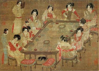 本图描写后宫嫔妃十人,围坐于一张巨型的方桌四周,有的品茗,也有的在行酒令。中央四人,则负责吹乐助兴。所持用的乐器,自右而左,分别为筚篥、琵琶、古筝与笙。旁立的二名侍女中,还有一人轻敲牙板,为她们打着节拍。从每个人脸上陶醉的表情来推想,席间的乐声理应十分优美,因为连蜷卧在桌底下的小狗,都未被惊扰到!