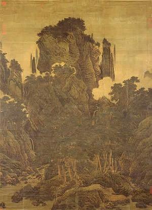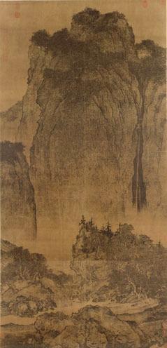 主峰旁边的远山上,题有「皇宋宣和甲辰(1124)春河阳李唐笔」,高龄的李唐表现的山石仍然是雷霆万钧的阳刚力量。主峰布置在画幅中央,左右有高低参差的插云尖峰。画中冈峦、峭壁似刚被斧头凿过的痕迹,是典型的斧劈皴法,这一片石质的山,显现出特别坚硬的感觉。山腰处朵朵白云,好像是冉冉欲动,一方面把群山的前后层次感划分出来,还使画面有了疏密相间的效果,也使整个气氛上有柔和调剂的一面,不会因为太密、太实而让欣赏者有过分的压迫感。山巅的丛树,近树的松林,有隐有现的石径,加强了画面幽深的情调。左方中景各有瀑布一线垂下,几折而后,转成一滩溪涧,涧水穿石而过,如闻声响,真是画到有声就是诗。