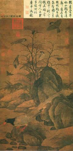 此幅中景物有动有静,配合得宜。像山鹧跳到石上,伸颈欲饮溪水的神态,就十分生动。另麻雀或飞、或鸣、或俯视下方,是动的一面;而细竹、凤尾蕨和近景两丛野草,有的朝左,有的朝右,表现出无风时意态舒展的姿态,则都予人从容不迫和宁静的感觉。下方的大石上,山鹧的身体从喙尖到尾端,几乎横贯整个画幅。背景则以巨石土坡,搭配麻雀、荆棘、蕨竹,布满了整个画面。画的重心在于画幅的中间位置,形成近于北宋山水画中轴线的构图方式。而具有图案意味的布局,有着装饰的效果,显示作者有意呈现唐代花鸟画古拙而华美的遗意。