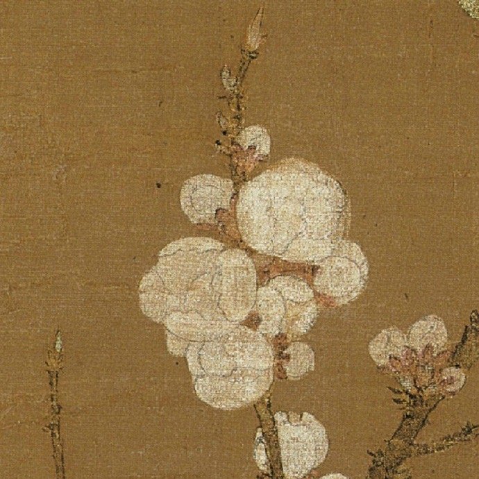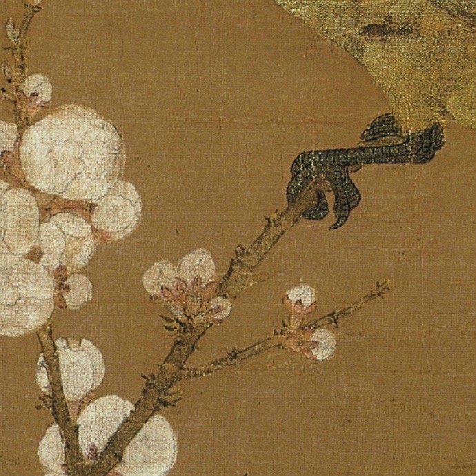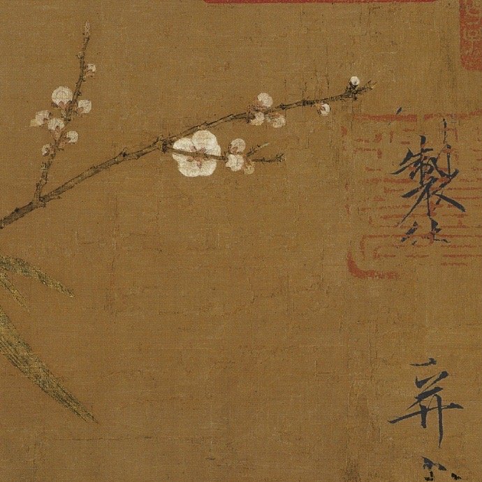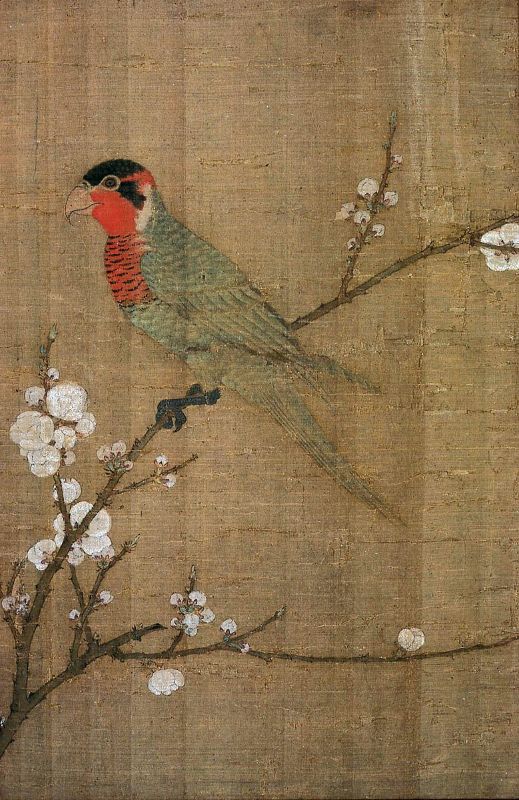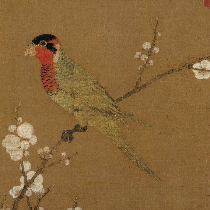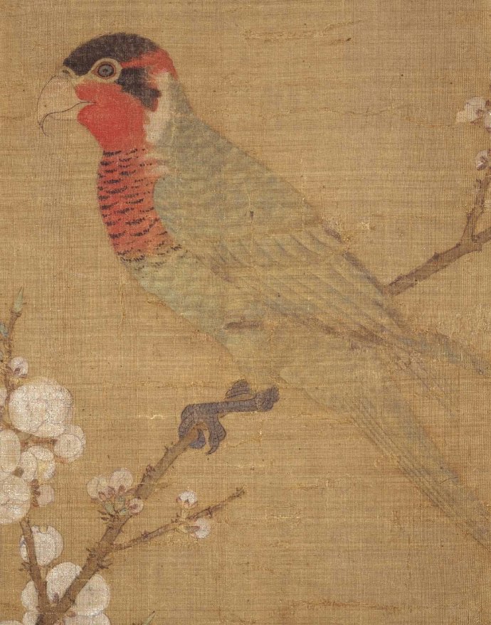 在观看这幅徽宗作品时,写实水平极佳,用色非常和谐,绢素的材料质地一流,虽然时代久远依然华贵。首先,观察绘鹦鹉的水平,可以说达到逼真的程度,鹦鹉的深邃眼神仿若实物,羽毛层染立体感强烈,爪子站立在树枝上,重心、比例准确;其次,杏花开放各种姿态万千,层次清晰可见,树枝尚处于春天未发叶芽,偶见点点绿头,枝干犹如处于眼前,动感明显。笔者看到此时,被画中的一切所感染,仿佛置身于春天杏花开放的时节,树木与鹦鹉如在眼前。难道这就是道君皇帝亲笔吗?作为一个皇帝,真的有此神功吗?简直难以置信!