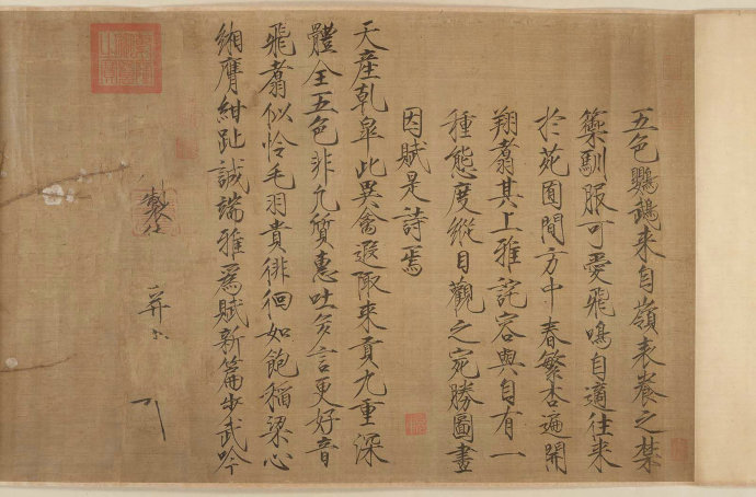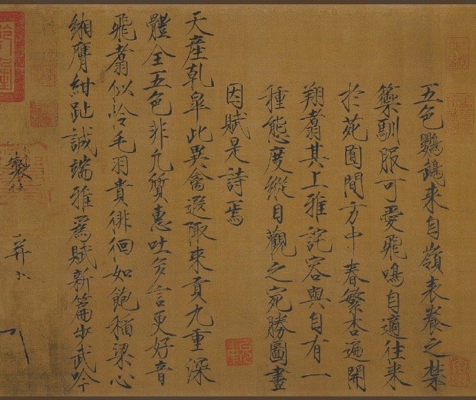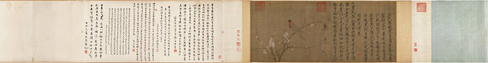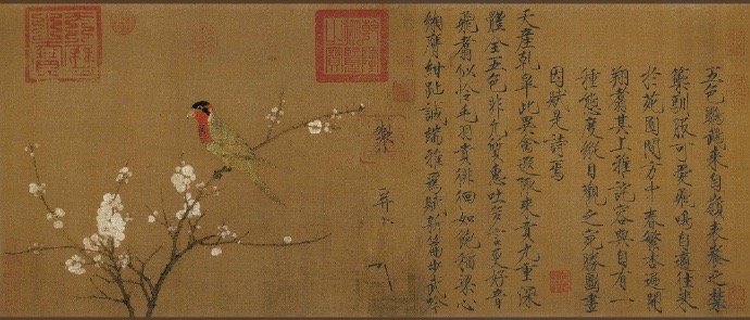 波士顿博物馆藏宋徽宗赵佶《五色鹦鹉图》卷,绢本,设色,款署:“无色鹦鹉,来自岭表。··· ···为赋新篇步武吟。御制御画并书,天下一人”。钤:“御书”朱文印。