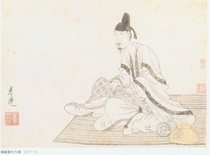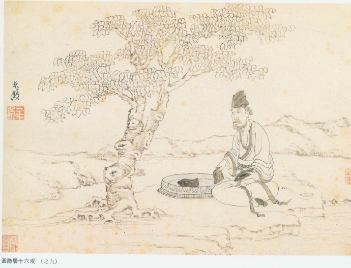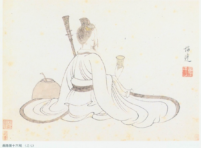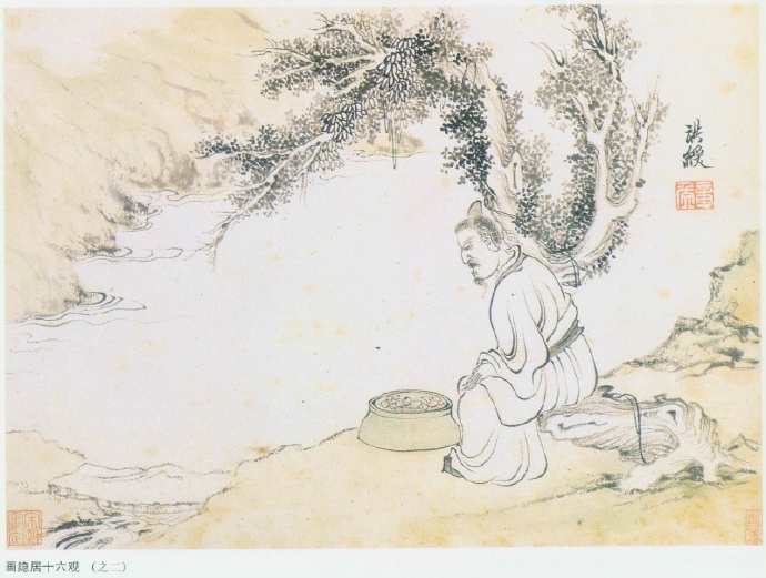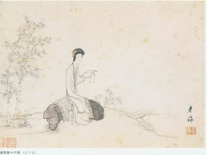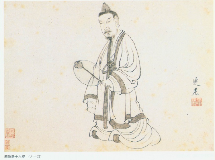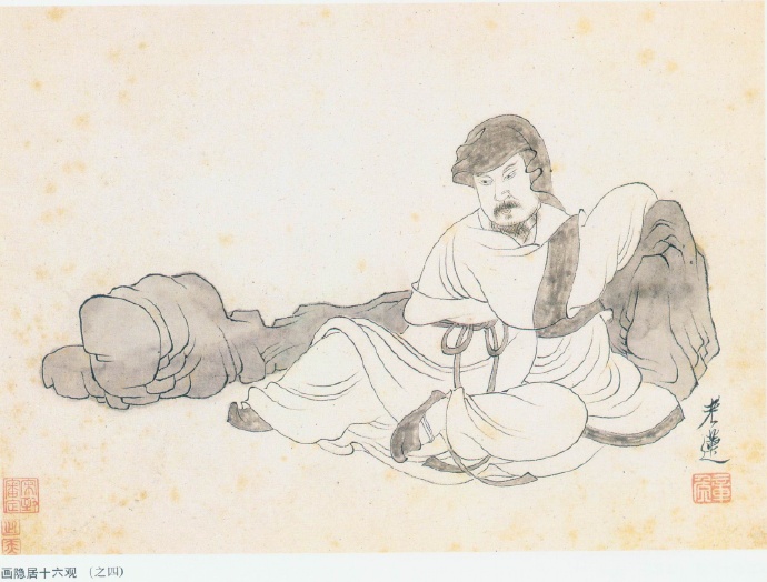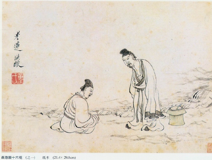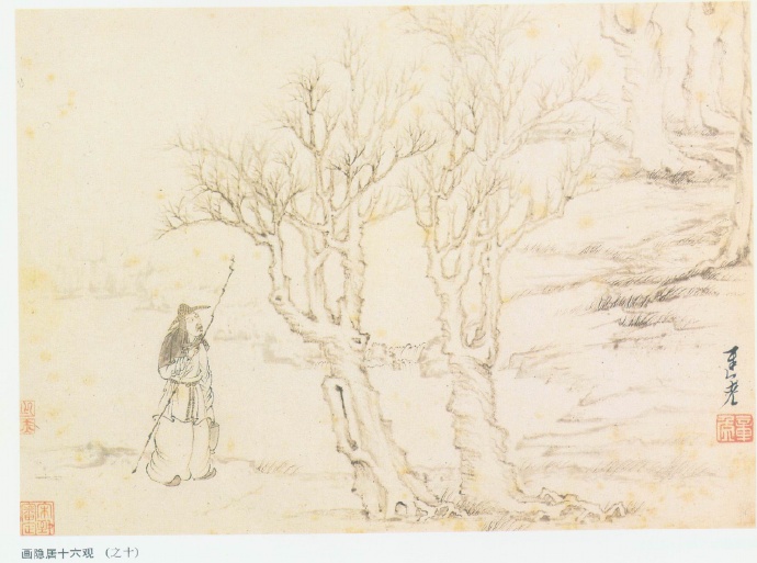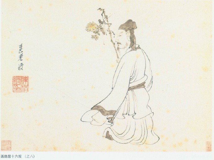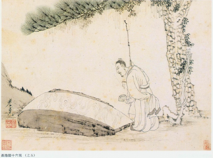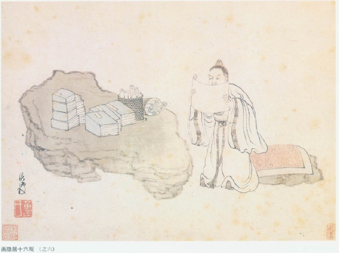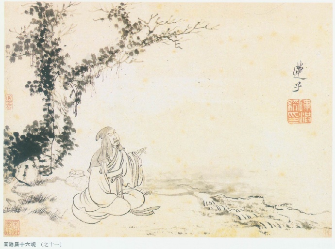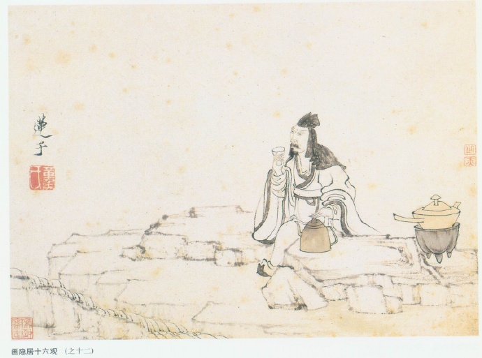 纸本淡设色,纵21.4、横29.8厘米,台北故宫博物院藏。主题为访庄,醸桃,浇书,醒石,喷墨,味象,漱句,杖菊,浣砚,寒枯,问月,谱泉,囊幽,孤往,缥香,品梵。末开自识:洪绶画赠石天先生,时辛卯中秋。钤章侯、陈洪绶印等印三方。为晚年极品。次年去世,54岁。