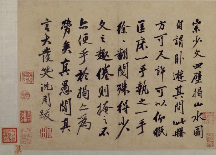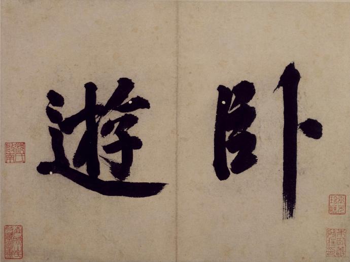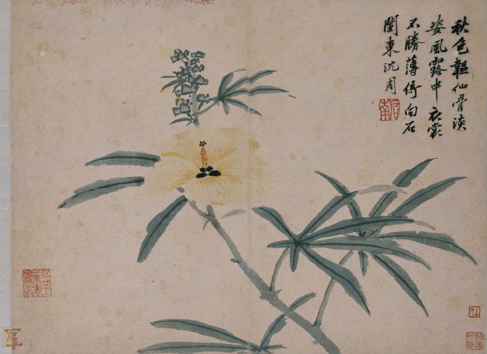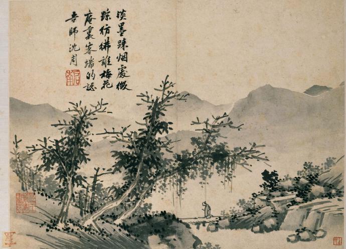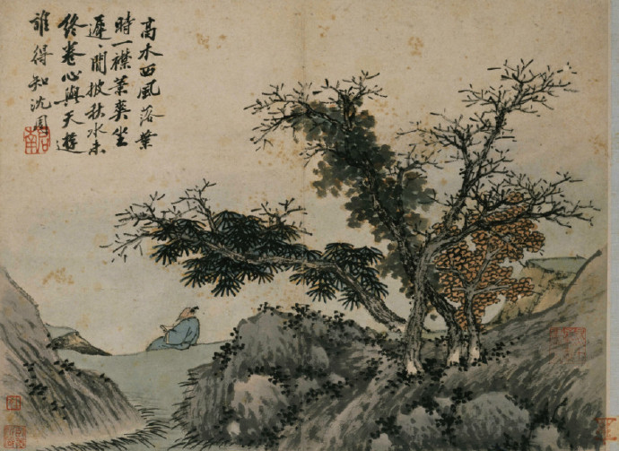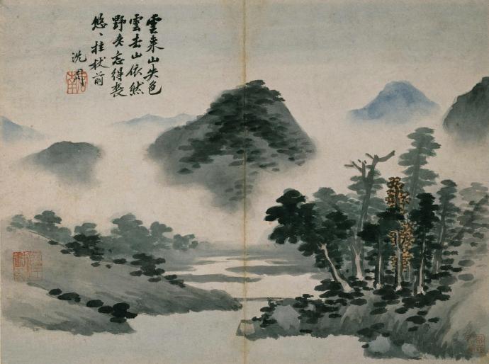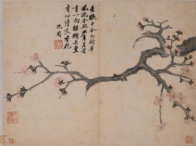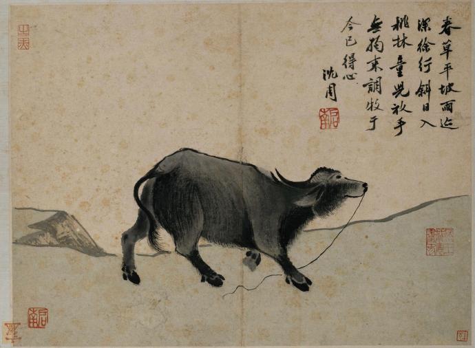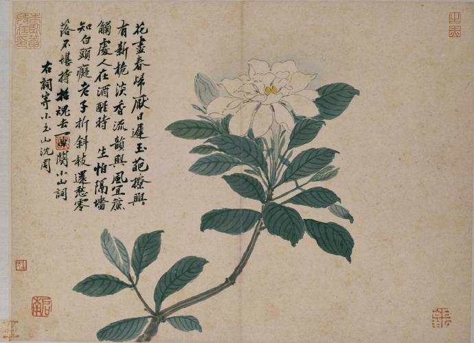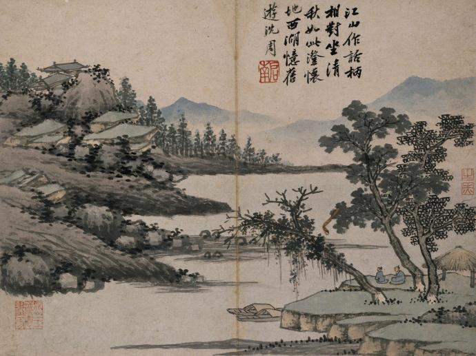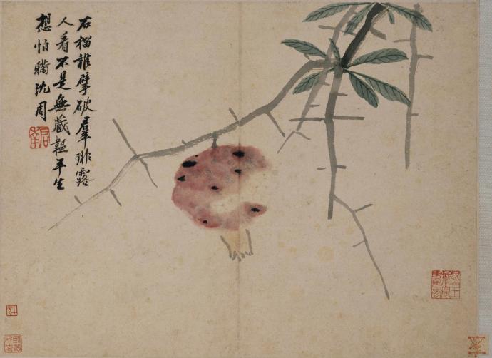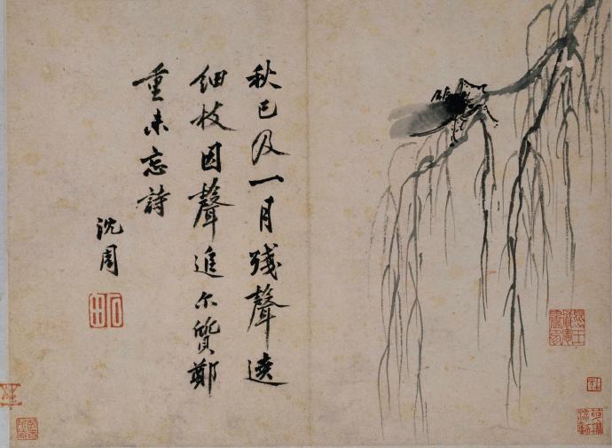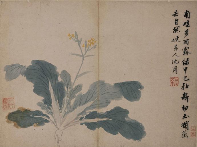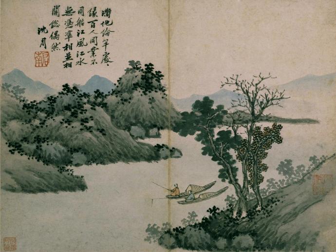 《卧游图》册,明,沈周绘,纸本,设色,共十七开,每开纵27.8cm,横37.3cm。北京故宫博物院藏。首开自书“卧游”,钤朱文“沈氏启南”印,其后分别绘石榴、平坡散牧、栀子花、山水小景、秋山读书、枇杷、雏鸡、芙蓉、仿倪山水、梅花、杏花、秋柳鸣蝉、江山坐话、白菜、江山垂钓、仿米山水、雪江渔夫等山水、花鸟小景。每幅画中均有画家自题,结合画面物象抒发其内心感受。落款后钤朱文“启南”、白文“石田”或白文“石田翁” 等印。