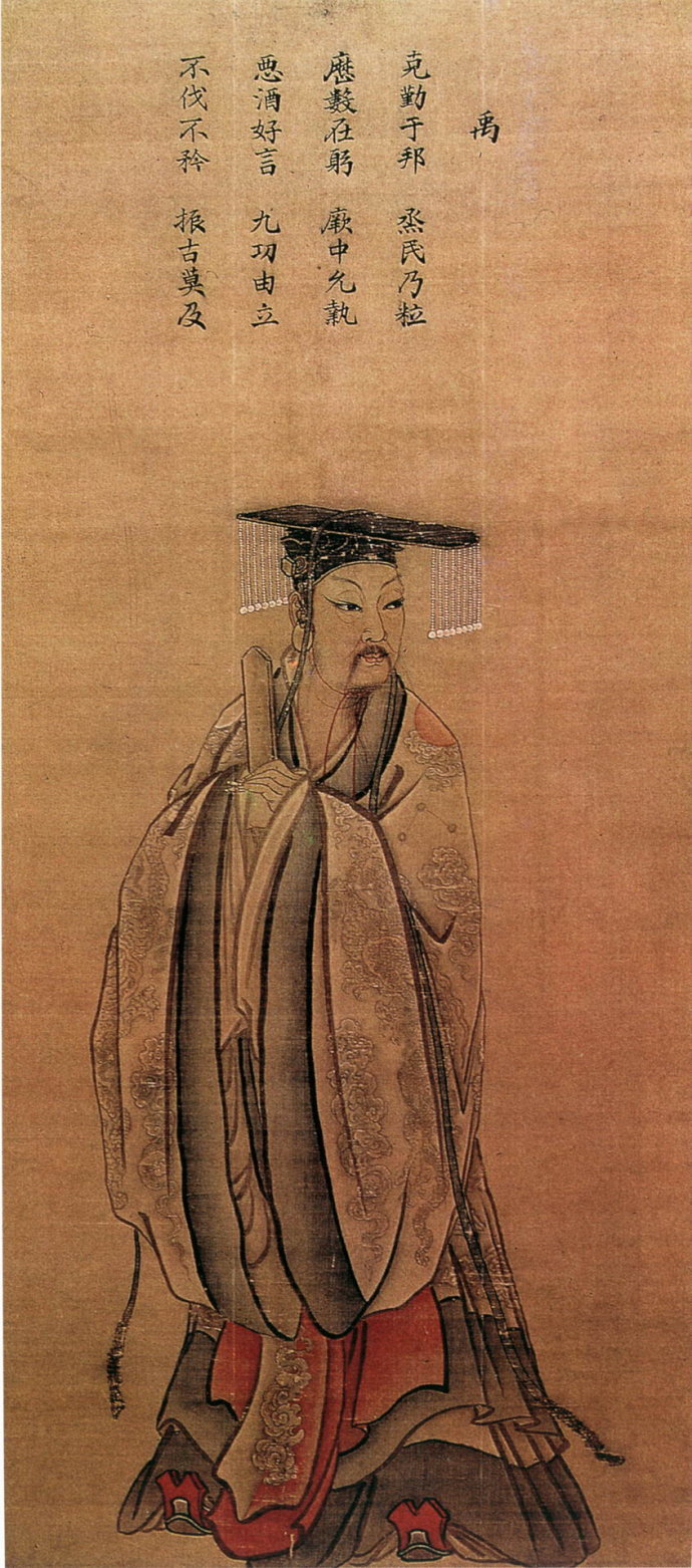 夏禹,传说中古代夏部落的领袖,姒姓,名文命,亦称大禹。此图绘夏禹手持如意笏,头戴王冠,身披龙袍,端庄地立于画面的正中。作者充分地利用线条的造型的能力,生动地刻画了夏禹慈祥和蔼的形象和内在性格。