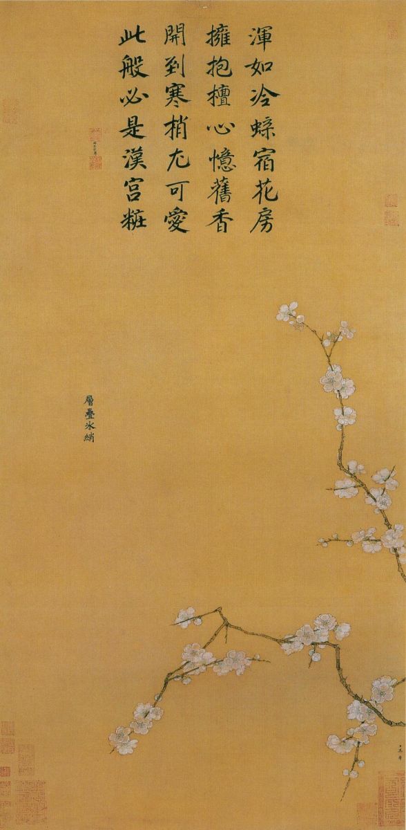 本幅款署“臣马麟”。另有宋杨皇后题图名“层叠冰绡”,并题诗:“浑如冷蝶宿花房,拥抱檀心忆旧香。开到寒梢尤可爱,此般必是汉宫妆。赐王提举。”钤:“丙子坤宁宝”、“杨姓之章”。