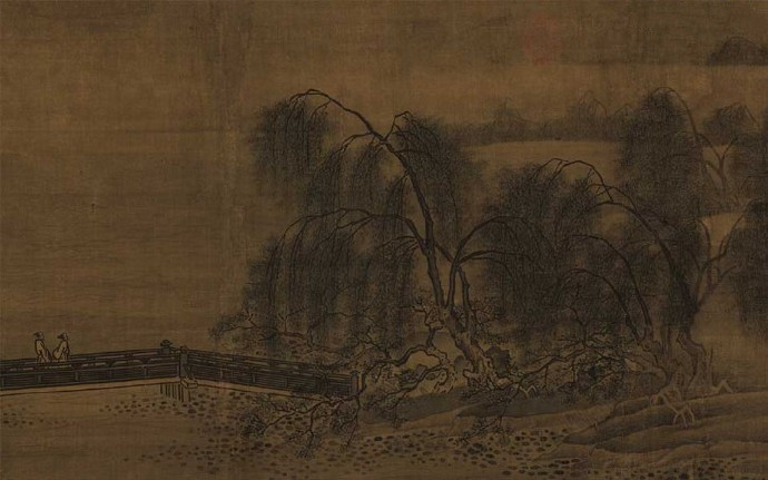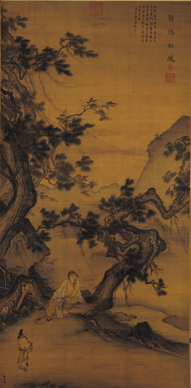 马远儿子马麟亦是丹青好手,承其父风格,图为马麟的《静听松风图》画一高士卧坐在如虬龙般屈曲蜿蜒的古松下,聆听松风,一童子立其旁。构图形成上下相对的三角形,有一种稳定中不泛动感,远处山丘淡墨渲染,空朦迷离,雾里水滩,也是李唐江南图式的伸延,弱化背景突出松石与主体人物,表现画家的主旨。